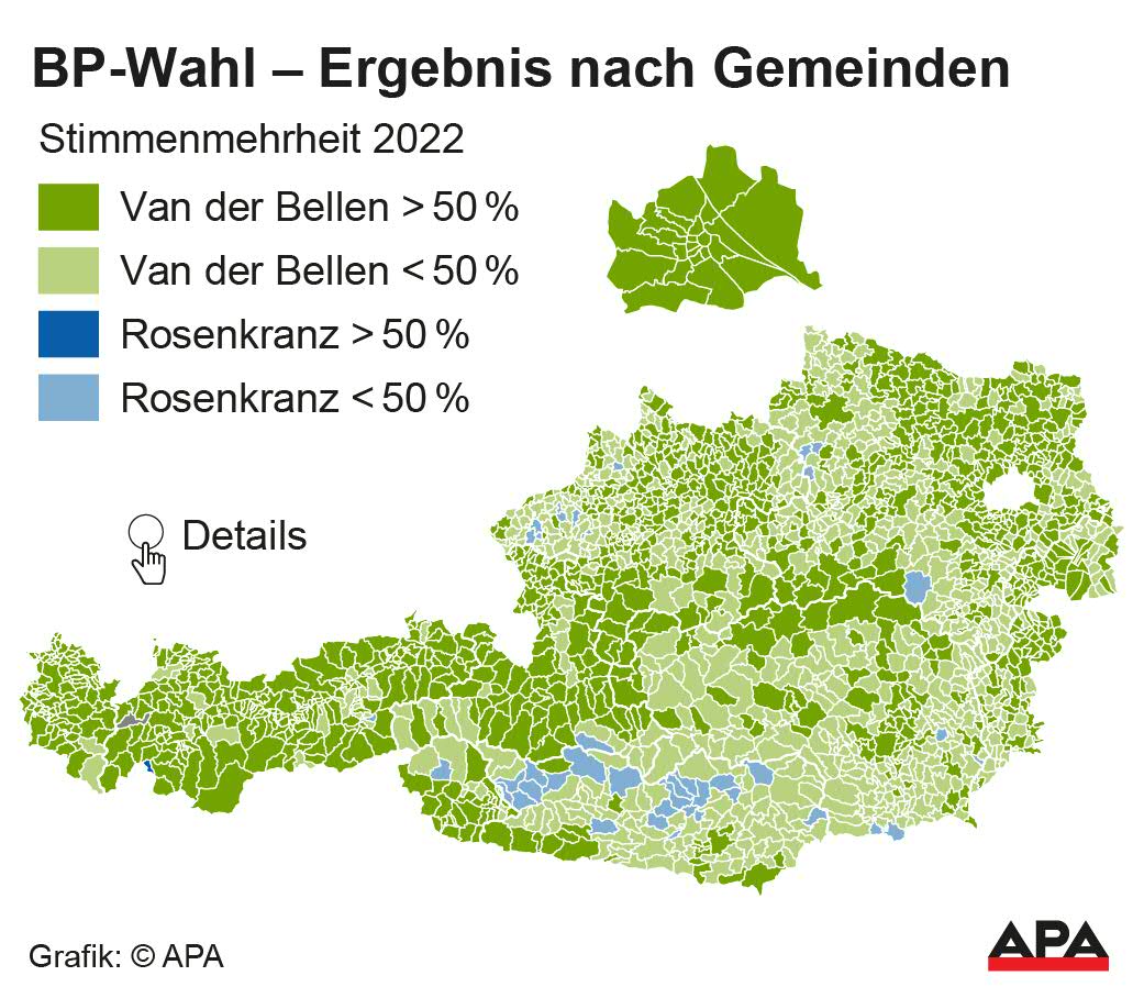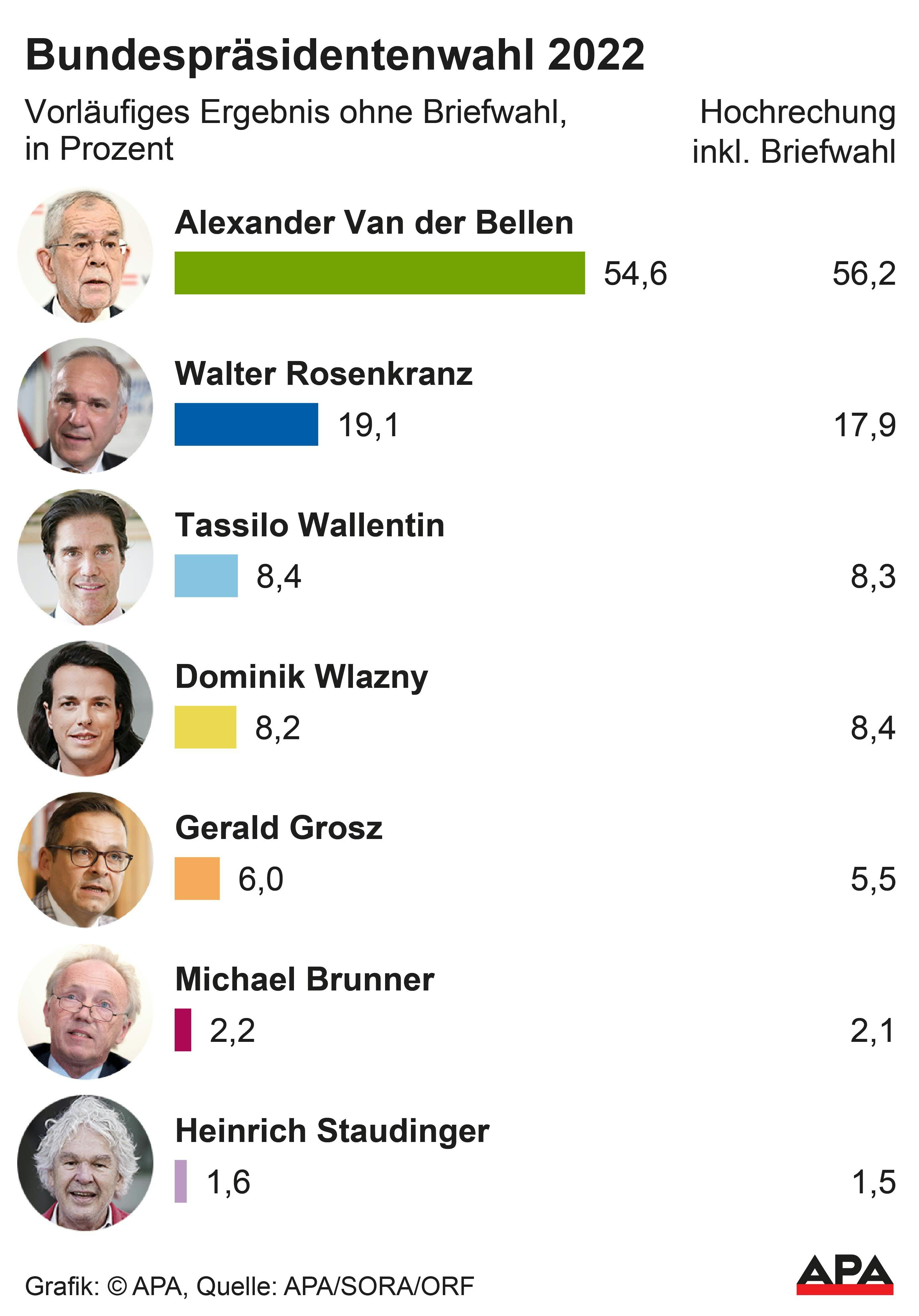 In dem am Abend bekannt gegebenen vorläufigen Endergebnis - noch ohne Briefwahl - kam der Ex-Grünen-Chef auf 54,6 Prozent der Stimmen. Damit ist keine Stichwahl nötig. FPÖ-Kandidat Walter Rosenkranz erreichte 19,1 Prozent und Platz zwei. Die Briefwahlstimmen, die erst am Montag ausgezählt werden, können noch geringe Änderungen bringen.