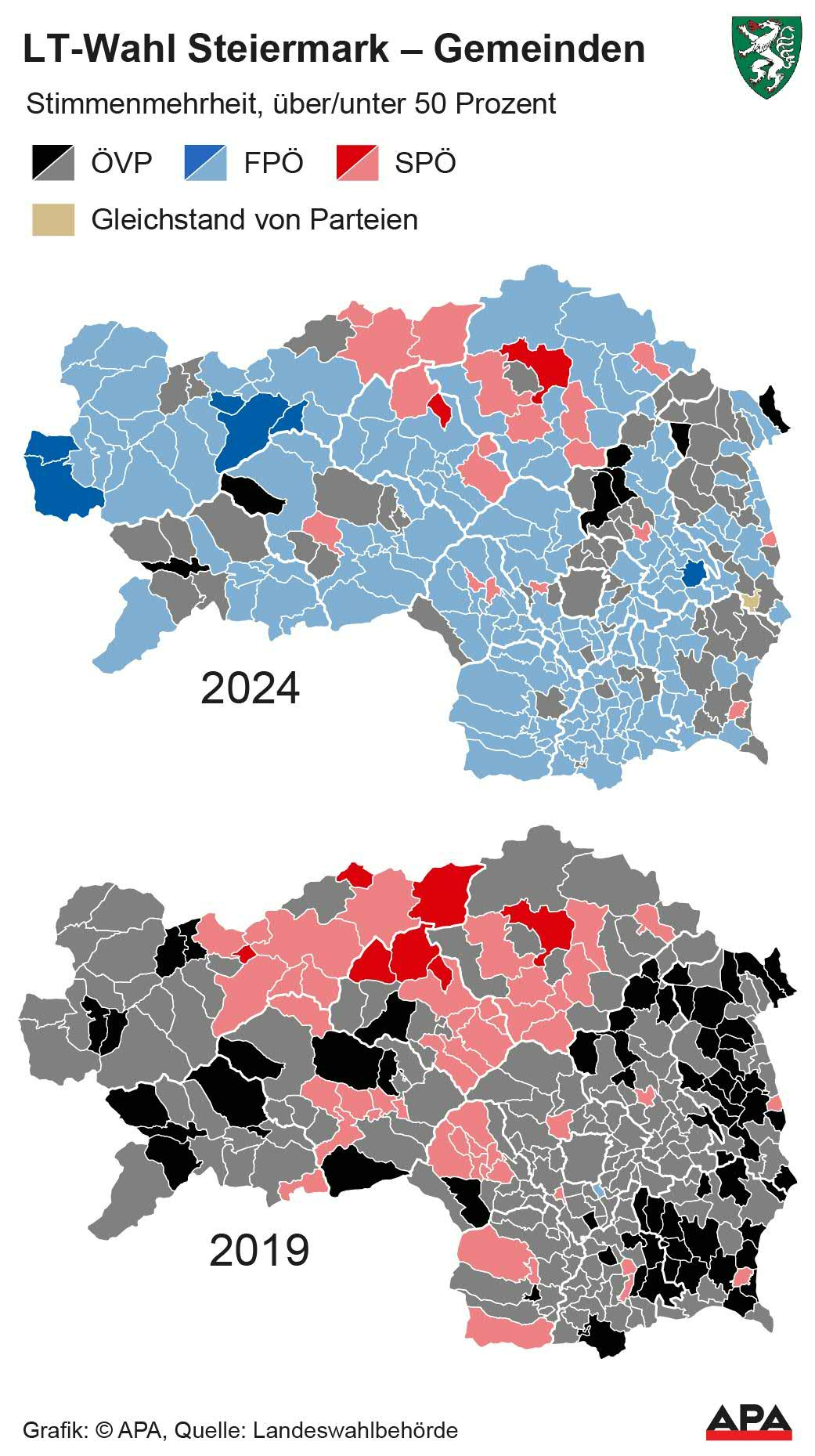 Nach Auszählung aller Gemeinden fuhr die SPÖ bei der Landtagswahl in der Steiermark mit 21,4 Prozent ein weiteres Rekord-Minus ein. Die Grünen kommen auf nur mehr 6,2 Prozent. NEOS (5,9 Prozent) und KPÖ bei (4,4) schafften den Einzug. Das Ergebnis inklusive Briefwahlschätzung umfasst auch die (wenigen) noch am Montag auszuzählenden Briefwahlstimmen. Die meisten der Briefwahlkarten sind bereits am Wahlsonntag mitausgezählt worden. Die Schwankungsbreite beträgt nur mehr +/- 0,3 Prozentpunkte.
