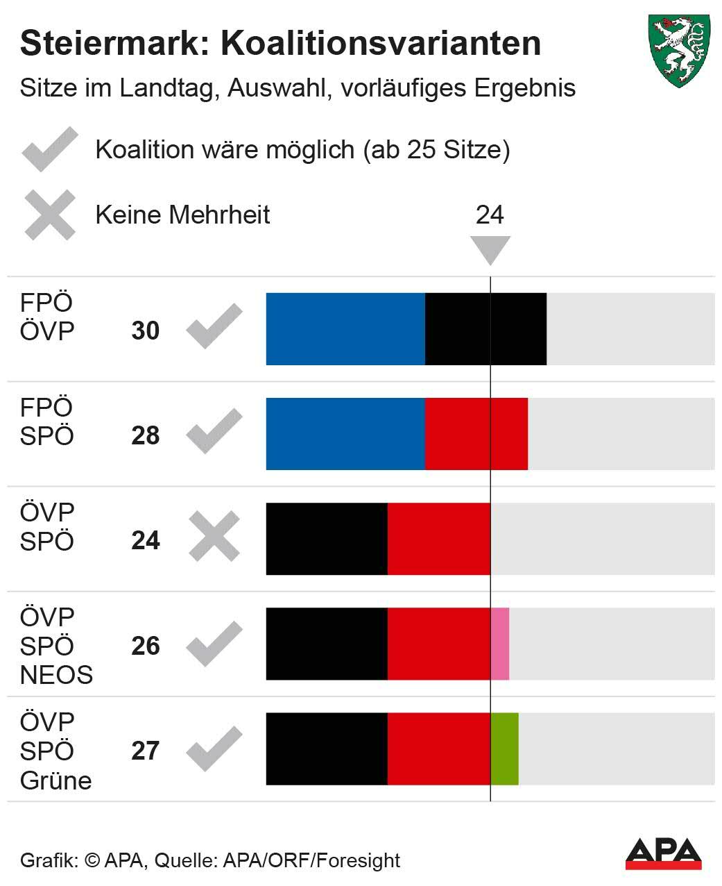 In Mandaten bedeutet das vorläufige Endergebnis der Steiermark-Wahl für die FPÖ künftig 17 Mandate (+9). Die ÖVP kommt auf nur mehr 13 (-5), die SPÖ auf elf Sitze (-1). Schwarz und Rot hätten damit im 48 Sitzen starken Landtag damit gemeinsam nur mehr 24 Sitze und die Mehrheit um einen Sitz verpasst. Durch die Wahlkarten könnte noch ein Mandat von der SPÖ zu den NEOS wandern, so Foresight.