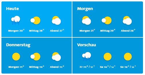Am Donnerstag geht es sonnig weiter und die Hitze erreicht ihren Höhepunkt mit Temperaturen zwischen 28 und 33 Grad. Es bleibt diesig und schwül, und am Nachmittag können erneut heftige Gewitter und Regengüsse auftreten.