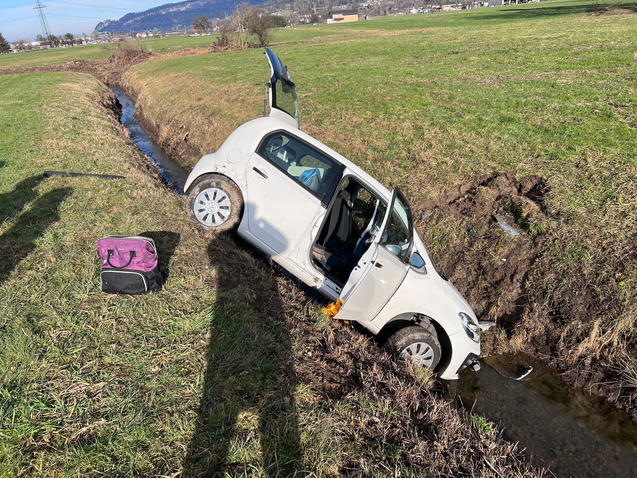 Der Kleinwagen kam von der Straße ab, querte die Gegenfahrbahn, fuhr rund 150 Meter über das angrenzende Feld, bevor die Fahrt in einem Riedgraben endete, wo der "Up!" liegenblieb.