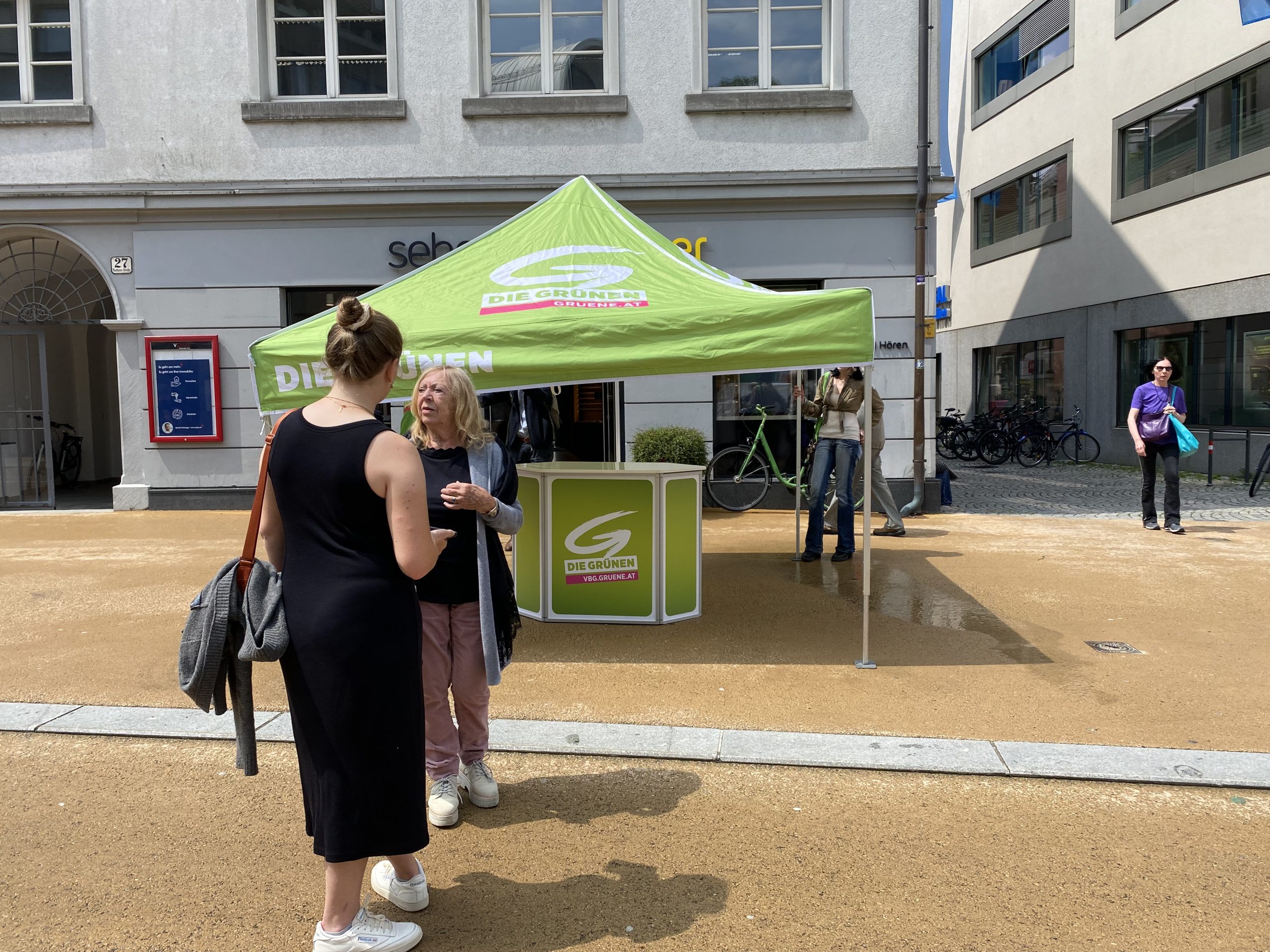 Obwohl die Innenstadt gut besucht ist, stehen am Freitag um 12 Uhr nur die Grünen draußen auf der Straße. Ob die anderen Parteien auf den Straßenwahlkampf verzichten, oder zu anderen Zeiten oder an anderen Orten anzutreffen sind, ist unklar. Große Ankündigungen gibt es auf keinem der Social-Media-Auftritte. Roswitha Steger geht seit 30 Jahren für die Grünen auf die Straße. Auch, wenn die Angriffe auf ihre deutschen Kollegen zunehmen, hat sie keine Angst. "Ich glaube, wir sind da in Vorarlberg noch recht gesegnet. Wir werden wohl blöd angesprochen oder beleidigt, aber Gewalttaten sind hier zum Glück noch nicht an der Tagesordnung", so Steger. "Einer hat zum Beispiel gesagt: 'Ihr scheiß Grünen, Euch sollte man umbringen.' Da bekomme ich dann wirklich einen Zorn. Aber ansonsten hilft es einfach freundlich zu bleiben und den Menschen einen schönen Tag zu wünschen", berichtet sie aus 30 Jahren Wahlkampf-Erfahrung.