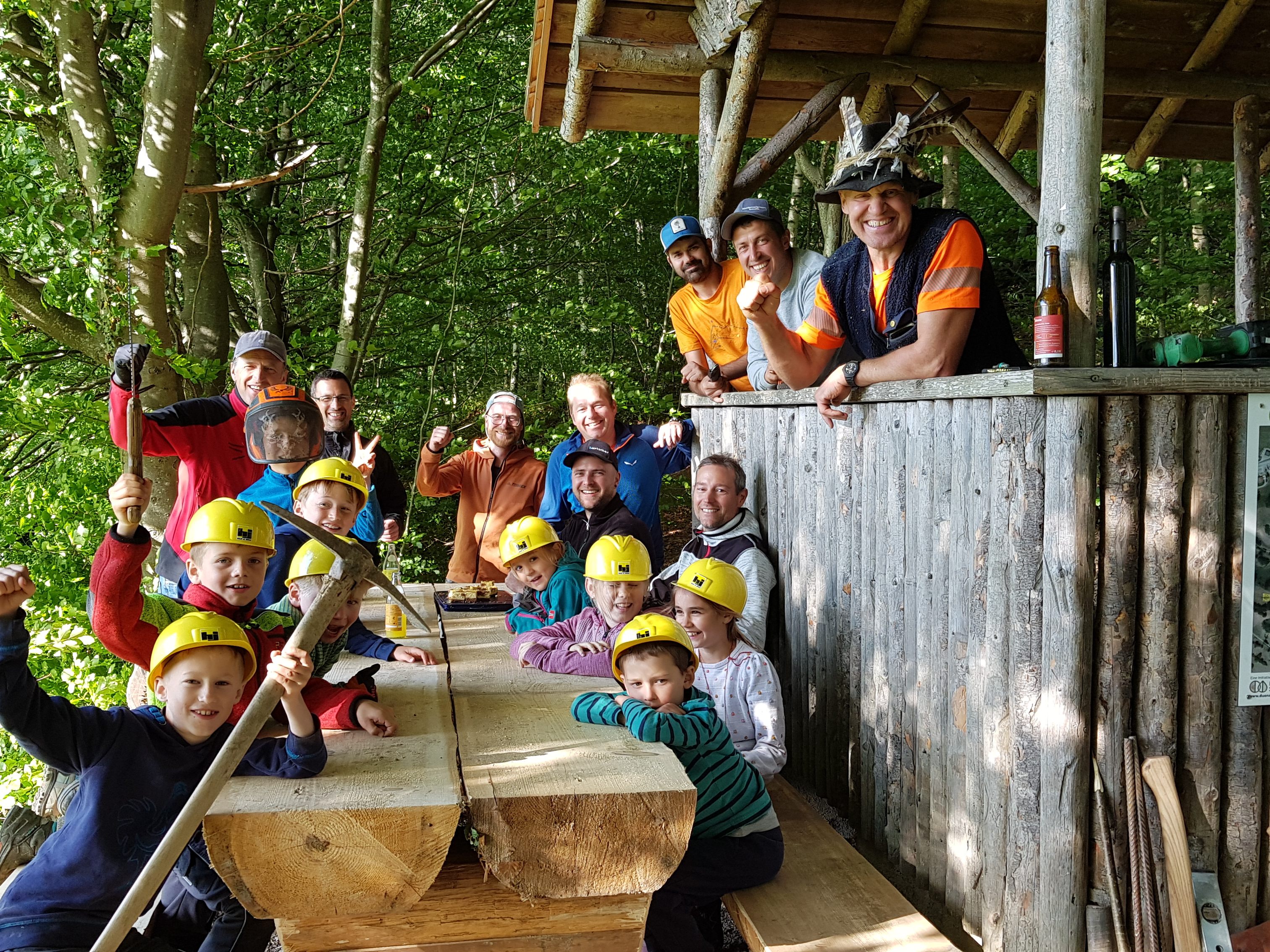 Dank den Vätern und Kindern, welche sich am 28. Mai 2022 beim Walderlebnistag mit viel Spaß darum kümmerten, darf das Blockhüsle in Schnifis sich über neue Sitzmöglichkeiten freuen.