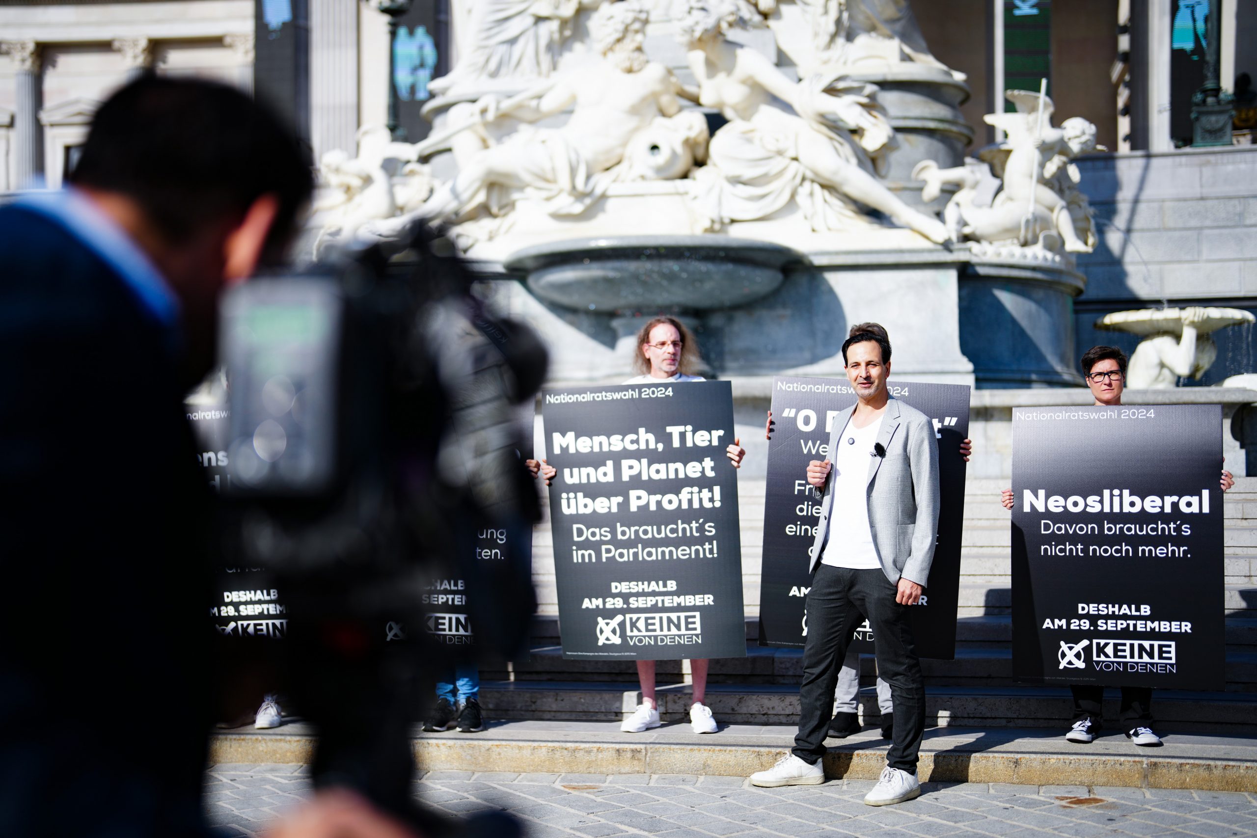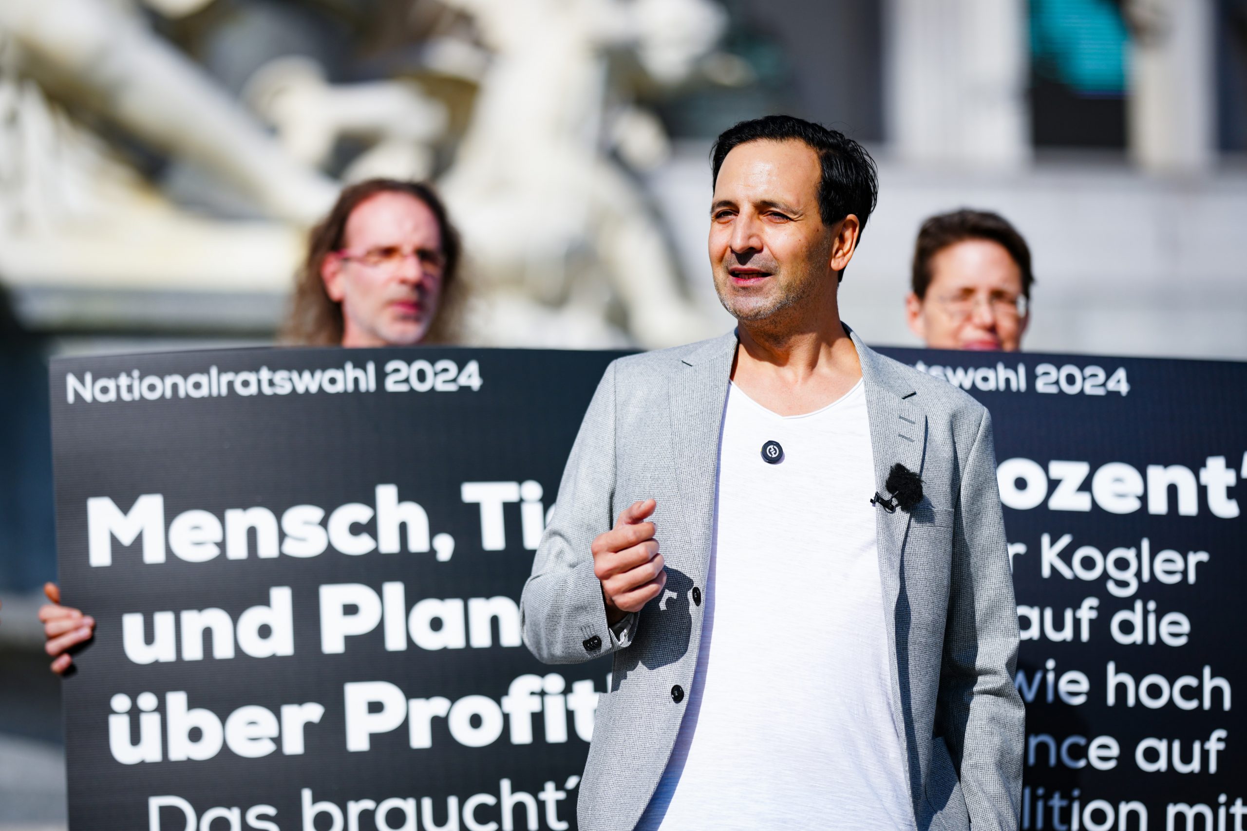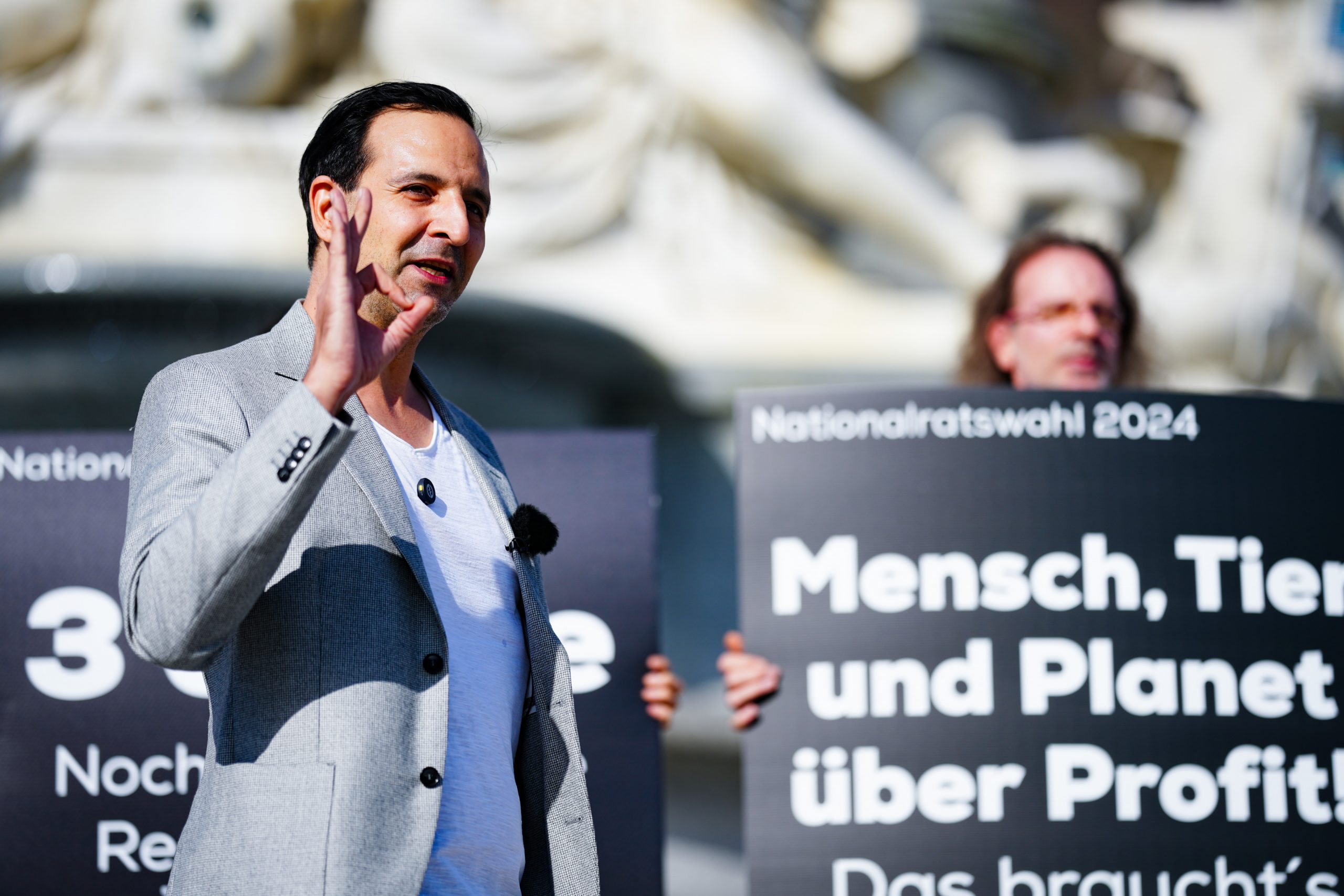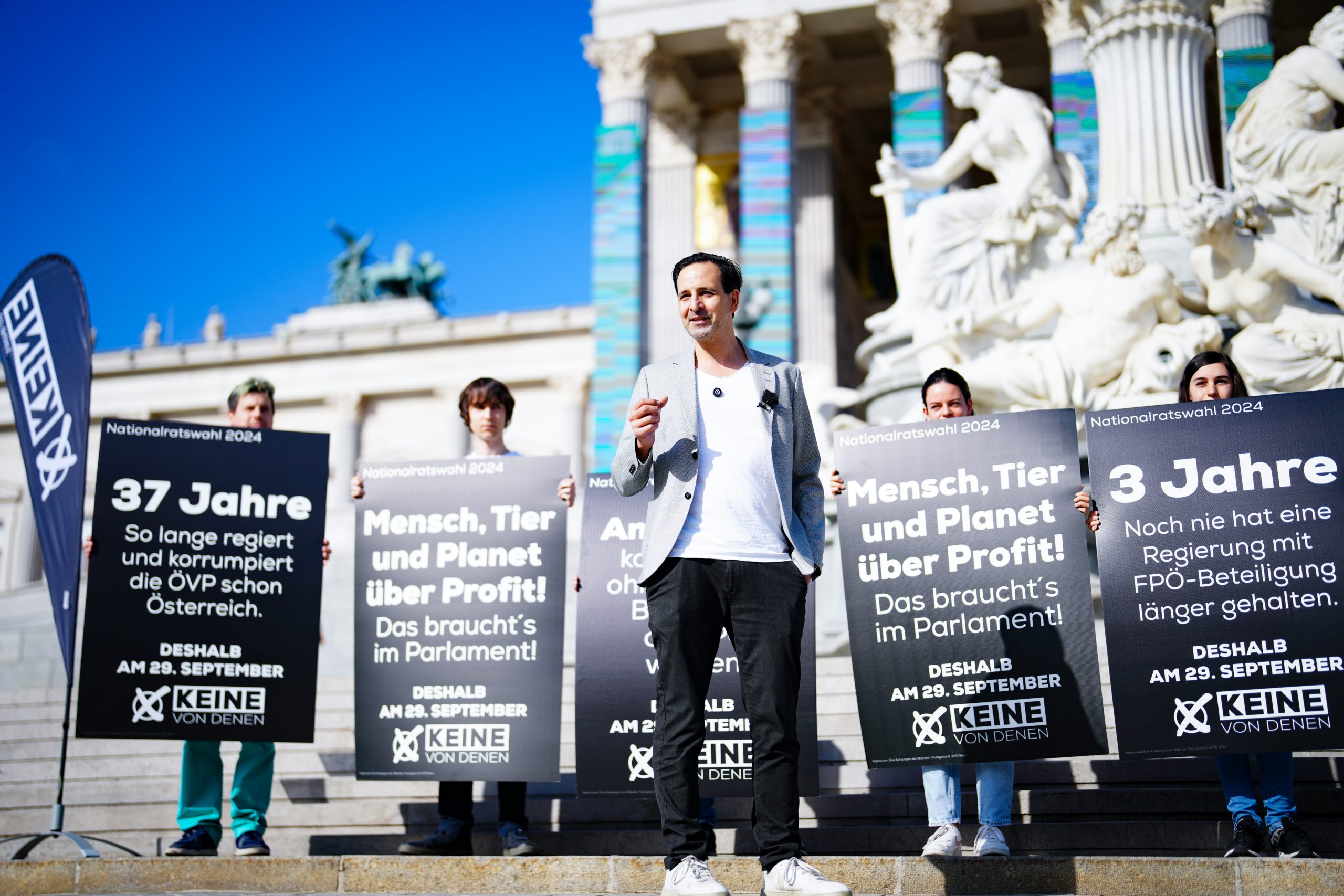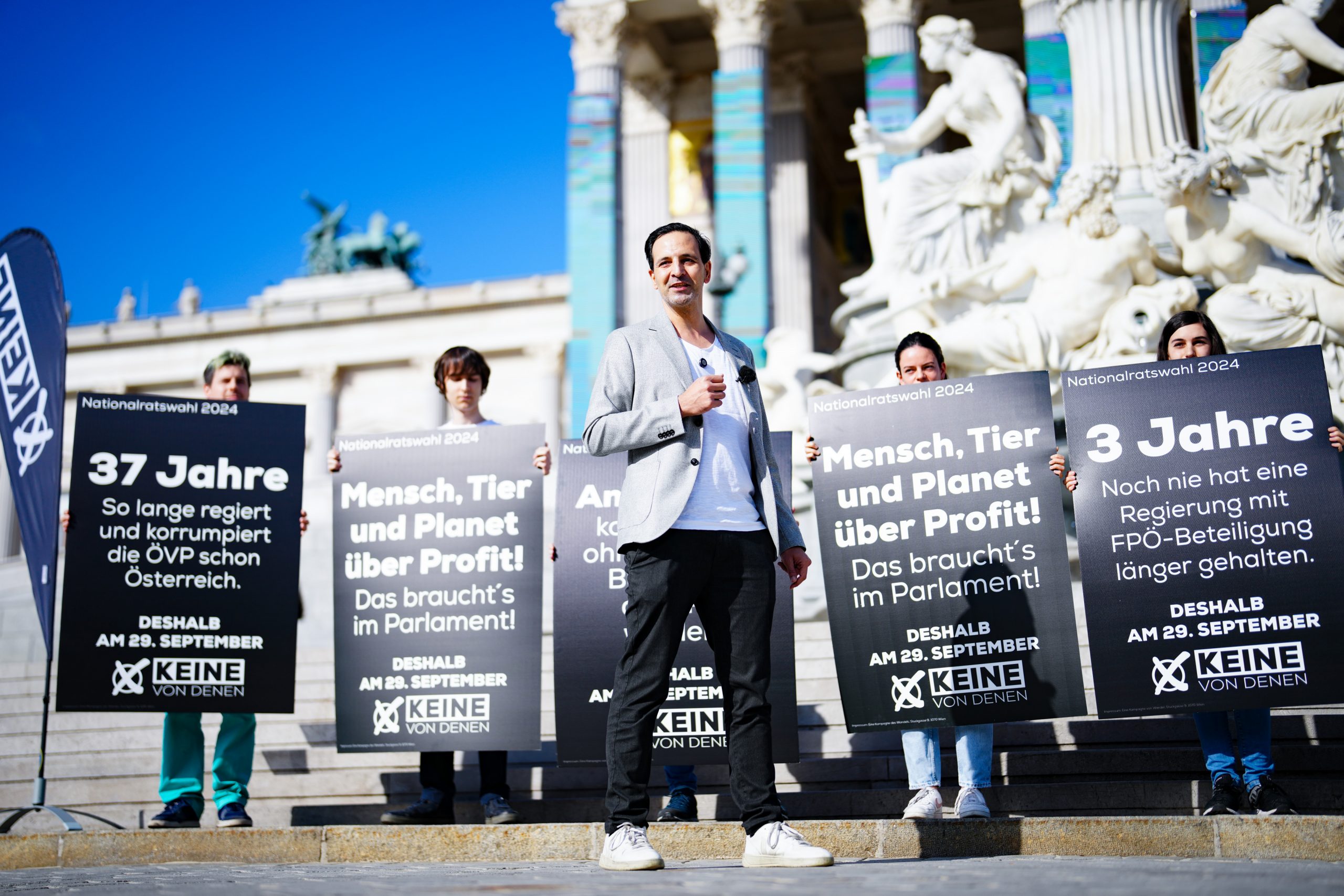 Auf fünf Sujets werden die aktuellen Parlamentsparteien kritisiert. Man selbst stelle dagegen das Wohl von "Mensch, Tier und Planet über Profit", wie auf einem zusätzlichen Plakat zu lesen ist. Damit würde man sich vom "Einheitsbrei" im Parlament unterscheiden, erklärte Spitzenkandidat Fayad Mulla am Montag.