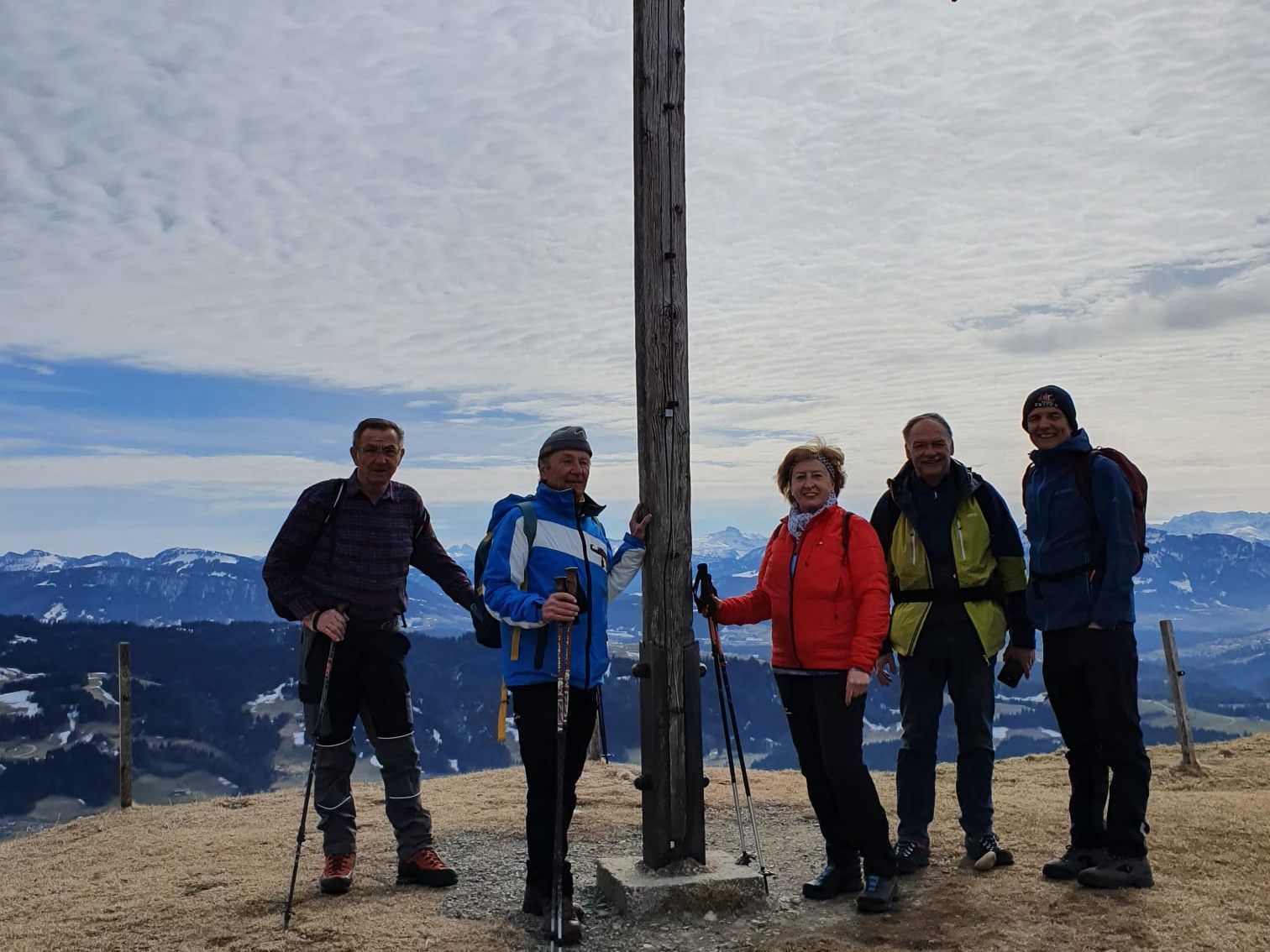 Mit Fahrgemeinschaften fuhr die Gruppe zum Gasthaus Stollen, wo die Wanderung begann. Herrliches Wetter und gute Stimmung unter den Teilnehmern war nicht zu übersehen. Anfangs auf asphaltierten Straßen und später durch Waldwegen erreichte die Gruppe nach ca. 1,5 Stunden das Gipfelkreuz vom Hirschberg. Ein frischer Wind, aber dafür herrliche Rundumsicht, zwang die Gruppe zum Abstieg zur Kapelle. Windgeschützt nach einer kurzen Rast machte sich die Gruppe auf zur Hirschbergalm.