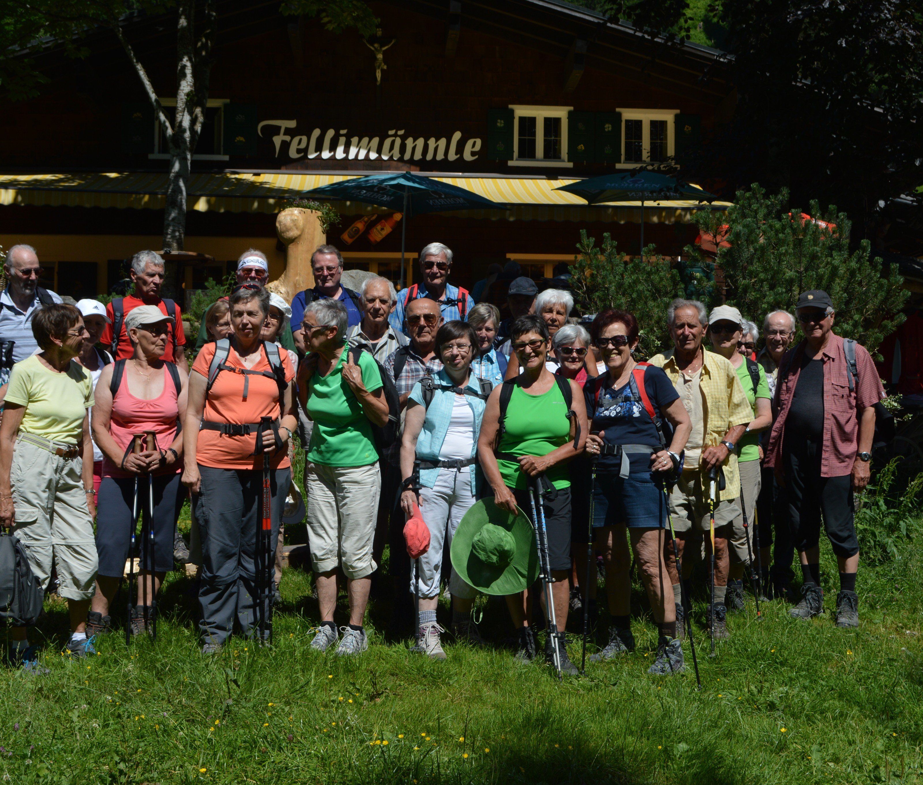 Nach 3 Stunden, Ankunft beil Fellimännle, erhitzt, durstig, teils a kle tschick und mit einem Schnäpsle empfangen. Die flotte Bedienung servierte Speis und Trank vom Besten. Nach 2 Stunden “ruben” gings dem Bach entlang wieder ins Silbertal und dort wartete uns der gekühlte Bus. Beim Fellimännle-Fischteich versuchte Hermann eine Floßfahrt, dabei kippte er um und lag samtm Häs im Wasser. Vermutlich wollte Hermann bei seinem Tauchgang gewaschenes “Silber” finden. Es war eine schöne, aber heiße Wanderung und beim Marsch zum Bus ist der Taucher wieder trocken geworden.