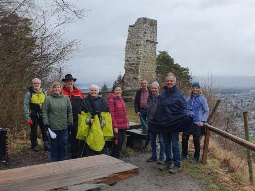 Genug der alten Gemäuer, der Regenschirm aufgespannt, den Regenmantel übergezogen, so machte sich die Wandergruppe auf den Nachhauseweg nach Höchst, wo wir bereits im Cafe Schallert freundlich empfangen und mit köstlichen Süßspeisen verwöhnt wurden. Eine kurze Analyse zu dieser Wanderung durfte natürlich nicht fehlen, bevor sich alle wieder auf den Nachhauseweg machten. Ein herzliches Dankeschön an Hans Herburger für die tolle und umsichtige Wanderführung.