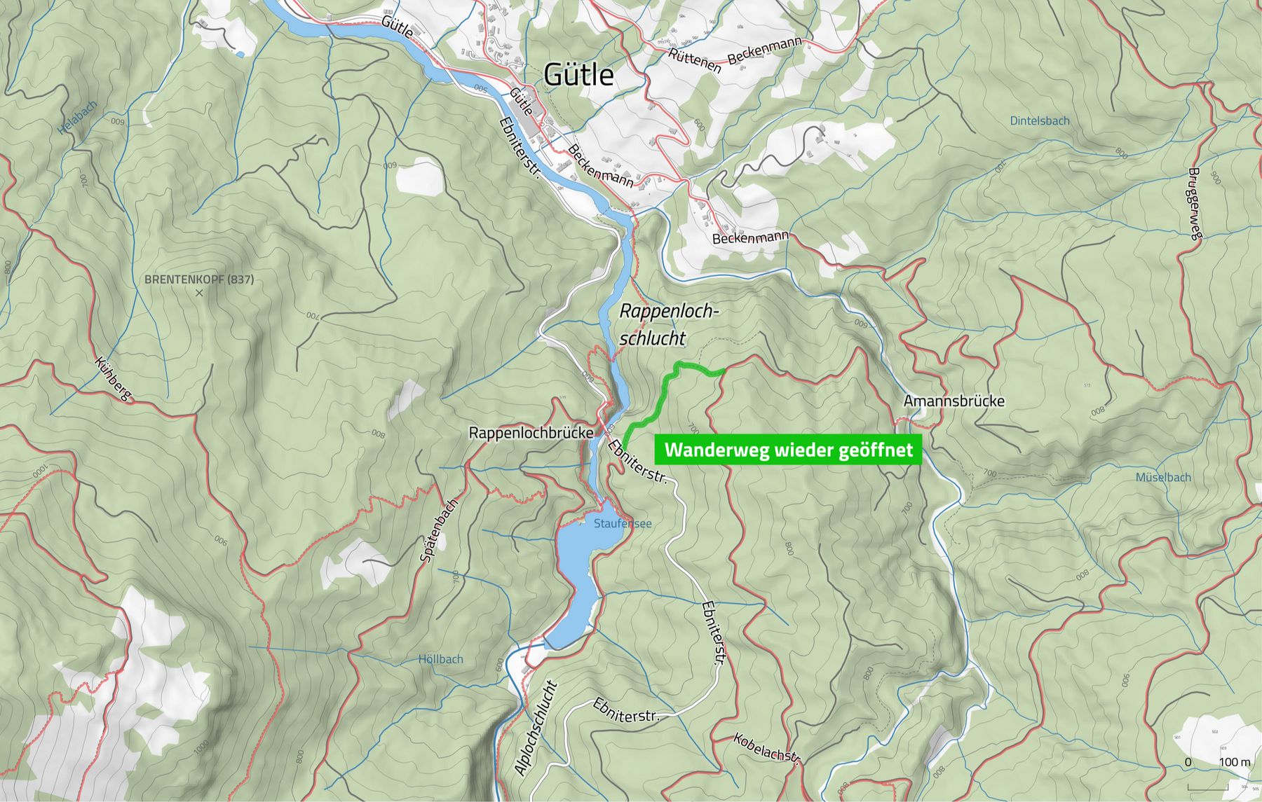 Die ursprüngliche offizielle Wanderwegverbindung zwischen der Rappenlochbrücke und der Ammannsbrücke – angelegt im Jahr 2012 nach dem Einsturz der Rappenlochbrücke im Jahr 2011 – ist damit wieder nutzbar. Die Neuanlage sorgt dafür, dass die Verbindung über Beckenmann bis Gütle auch weiterhin gewährleistet ist. Die Stadt Dornbirn weist darauf hin, dass der Weg ab sofort wieder begehbar ist und ersucht um Beachtung der geltenden Wintersperren in den Schluchten.