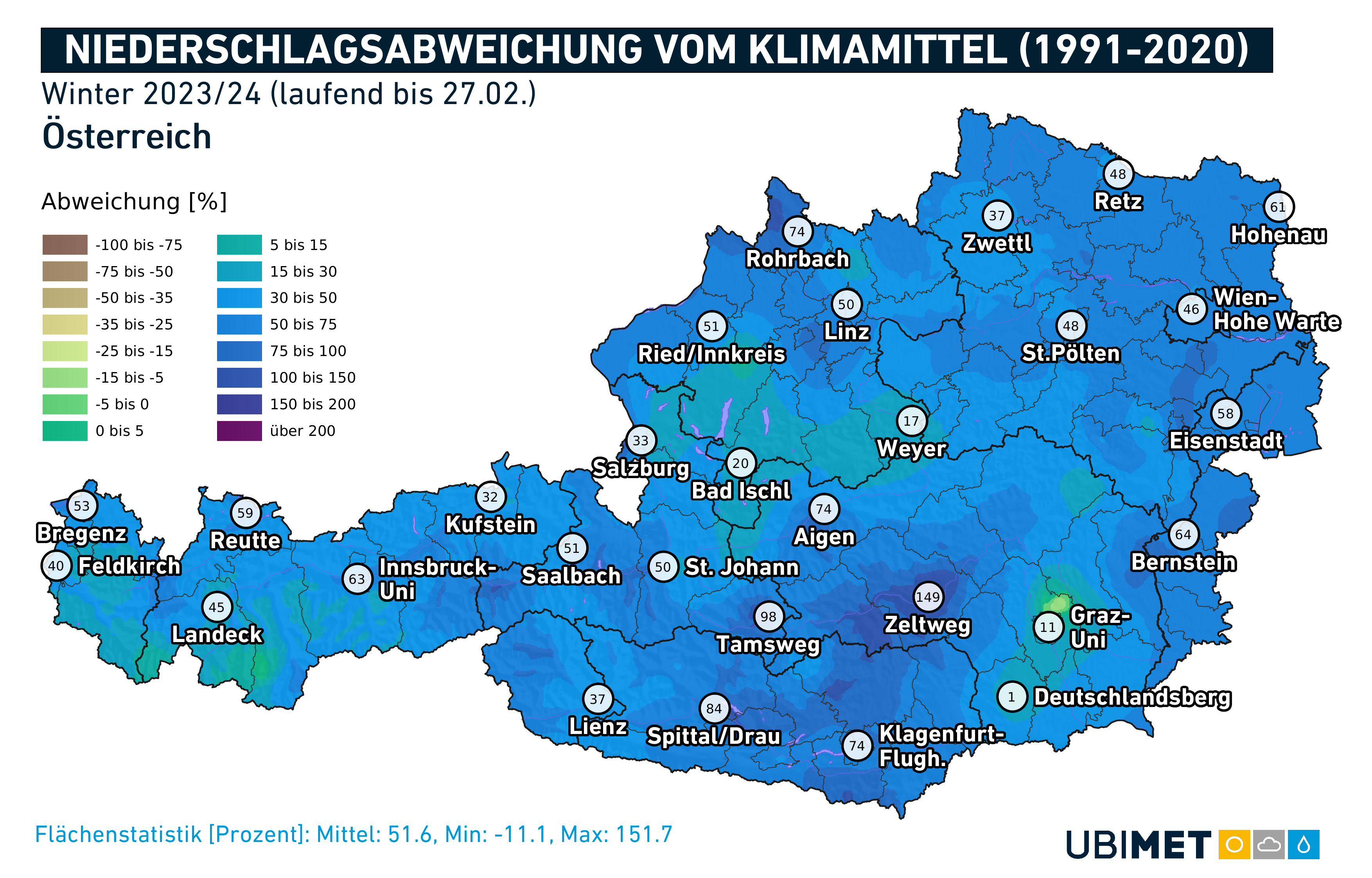 Der Winter war in ganz Österreich ausreichend bis außergewöhnlich feucht. Besonders von den Tauern bis in die westliche Obersteiermark und nach Kärnten fiel teilweise doppelt so viel Niederschlag wie erwartet. Landesweit liegt die Abweichung jedoch häufig bei +50 Prozent, nur im Grazer Becken und teilweise in den oberösterreichischen Voralpen war der Winter durchschnittlich feucht. Nach einem schneereichen Start im Flachland Anfang Dezember stieg die Schneefallgrenze im weiteren Verlauf des Winters meist auf Höhen über 150 m an. Aufgrund der feuchten Bedingungen gibt es am Ende des Winters oft überdurchschnittlich viel Schnee oberhalb von etwa 200 m, während in den meisten Niederungen bereits der Vorfrühling eingekehrt ist. Der diesjährige Winter zählt zudem mit 1.432 georteten Blitzen zu den gewitterreichsten seit Beginn der modernen Blitzverfolgung. Nur 2020 und 2012 gab es eine höhere Blitzaktivität. Gewitter spielen im Winter jedoch eine untergeordnete Rolle, im Durchschnitt gibt es in der kalten Jahreszeit österreichweit nur etwas mehr als 600 Blitzentladungen.