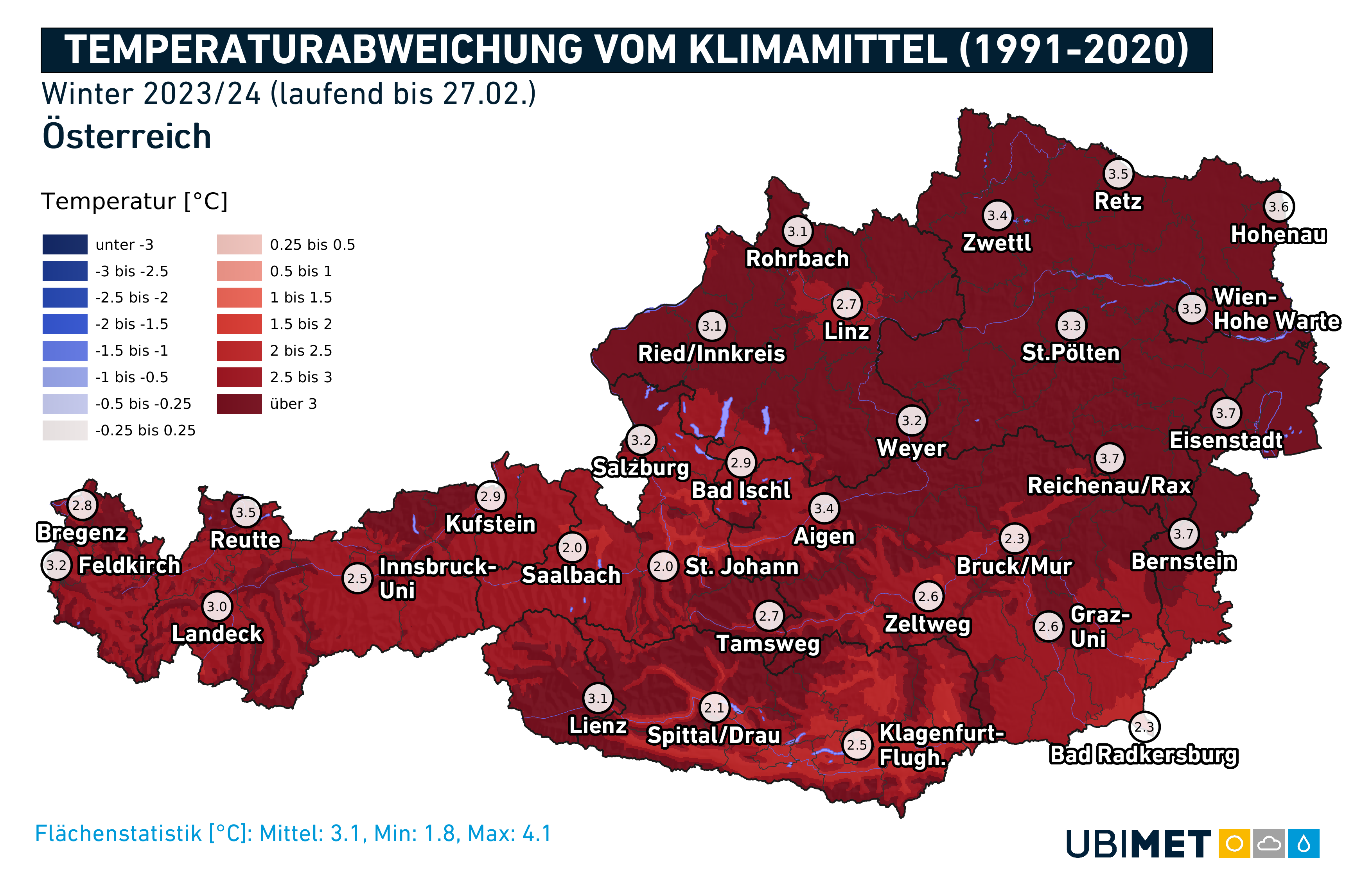 Der meteorologische Winter endet mit einem außergewöhnlich milden Februar. Im Durchschnitt lag die Temperaturabweichung gegenüber dem Mittelwert von 1991 bis 2020 bei +3,1 Grad. Die größten positiven Abweichungen wurden im Februar festgestellt, während die geringsten Abweichungen im Jänner verzeichnet wurden. Alle drei Monate waren jedoch deutlich über dem Durchschnittstemperatur, mit Abweichungen zwischen +1,3 und etwa +6 Grad. Der vergangene Winter war insgesamt der wärmste seit Beginn der Aufzeichnungen und löste den Winter 2006/07 als Spitzenreiter ab, wie Manfred Spatzierer, Chefmeteorologe der österreichischen Unwetterzentrale (www.uwz.at), analysierte.Besonders im Osten gab es deutlich überdurchschnittliche Temperaturen. In Niederösterreich, Wien und im Nordburgenland war der Winter durchschnittlich um 3,3 bis 3,7 Grad milder als im Zeitraum von 1991 bis 2020. In den geschützten Tallagen vom Salzburger Land bis nach Kärnten waren die Abweichungen etwas geringer, nämlich zwischen +2, und +2,5 Grad. Die außergewöhnliche Wärme zeigte sich vor allem in der Anzahl der milden Tage mit einer Höchsttemperatur von mindestens 10 Grad. In allen Landeshauptstädten außer Graz wurde dabei ein neuer Rekord verzeichnet.