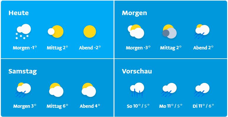 Nach Rückbildung von Restwolken und Hochnebel zeigt sich am Samstagvormittag zeitweise die Sonne. Am Nachmittag ziehen von Westen neue Wolken auf, abends beginnt es zu regnen, in höheren Lagen schneit es. Es wird milder, mit Tiefstwerten von -2 bis +2 Grad und Höchstwerten zwischen 4 und 7 Grad.