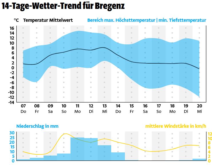 Ein Zwischenhoch bringt am Donnerstag noch strahlenden Sonnenschein nach Vorarlberg. Der Himmel zeigt sich überwiegend wolkenlos. Trotz frostigem Morgen erwärmt es sich tagsüber, besonders auf den Bergen. Die Höchsttemperaturen liegen zwischen 0 und 5 Grad.