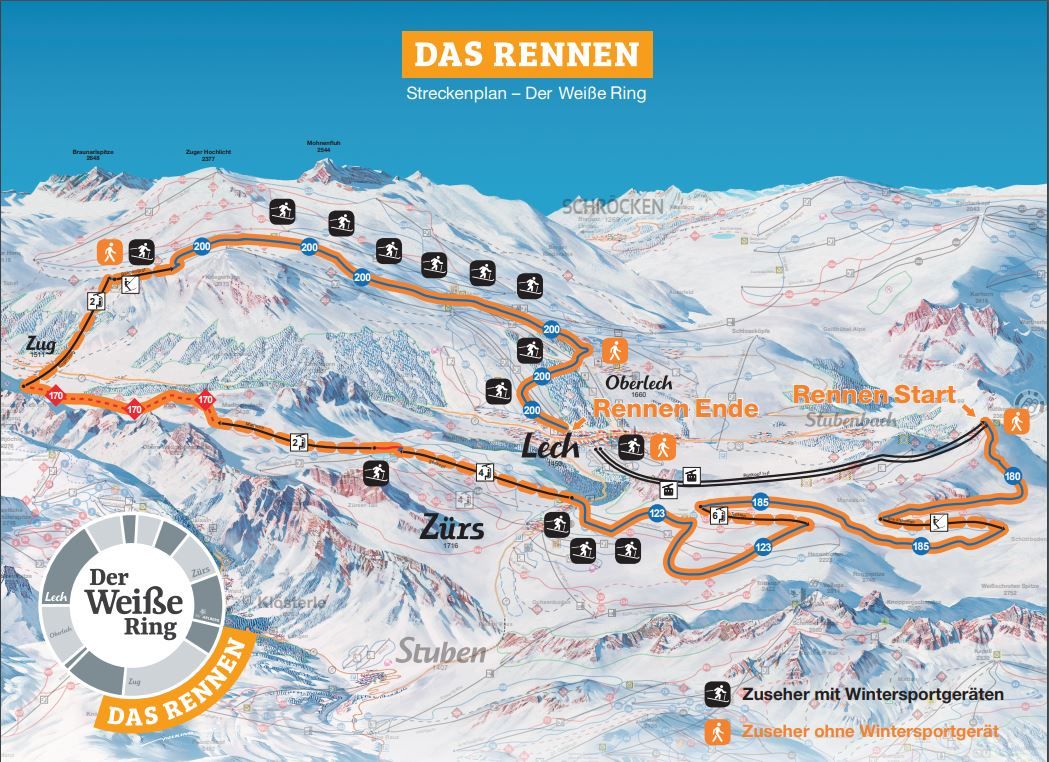 Es ist eines der längsten Skirunden-Rennen der Welt - Der „Weiße Ring“: Jährlich stehen 1000 Skifahrer und Snowboarder auf dem Rüfikopf (2.350 m) und warten auf den Startschuss. Die ersten Zwanzig werden dann auf die kräftezehrende Runde mit 5 Skiabfahrten, 5 Liften, einem intensiven Anstieg und einer anspruchsvollen Skitrasse geschickt. Alle 100 Sekunden folgt die nächste 20er-Gruppe.
