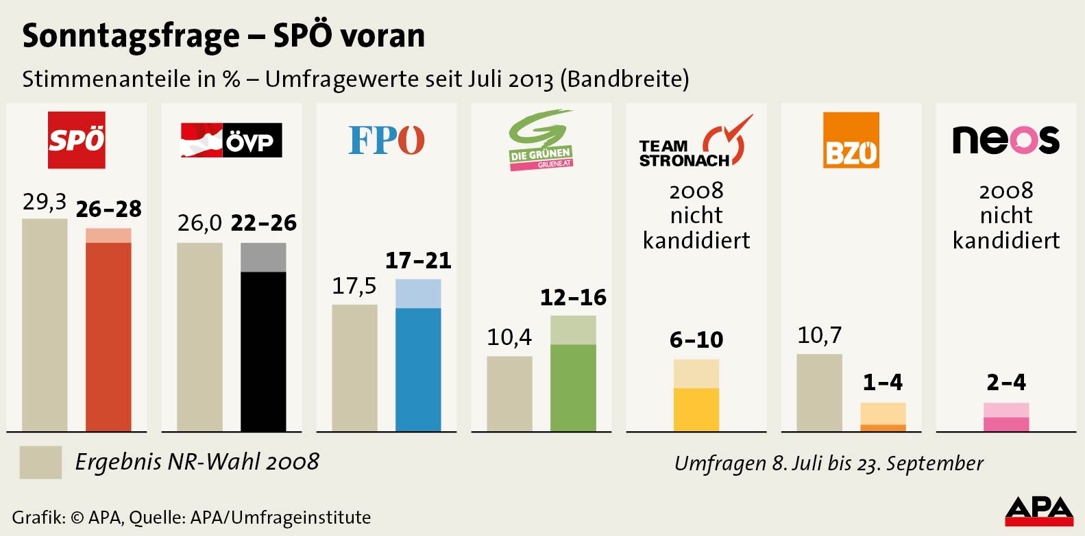 Laut aktuellen Umfragen werden FPÖ und Grüne gegenüber dem Ergebnis von 2008 wohl deutlich zulegen. Das Team Stronach wird laut vorliegenden Daten den Einzug locker schaffen, muss aber mit weniger Stimmen rechnen als noch in der ersten Jahreshälfte. Fraglich scheint der Einzug in den Nationalrat für das BZÖ. Und auch die neue Partei NEOS hat nur schwache Chancen auf das Überspringen der Vier-Prozent-Hürde. Betrachtet man die Umfragen seit Juli, so liegt die SPÖ in der Sonntagsfrage zwischen 26 und 28 Prozent; die ÖVP kommt auf 22 bis 26 Prozent, mit zuletzt fallender Tendenz.