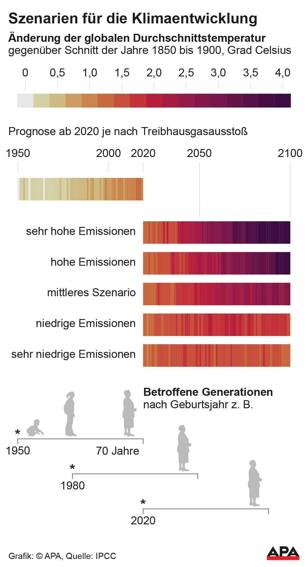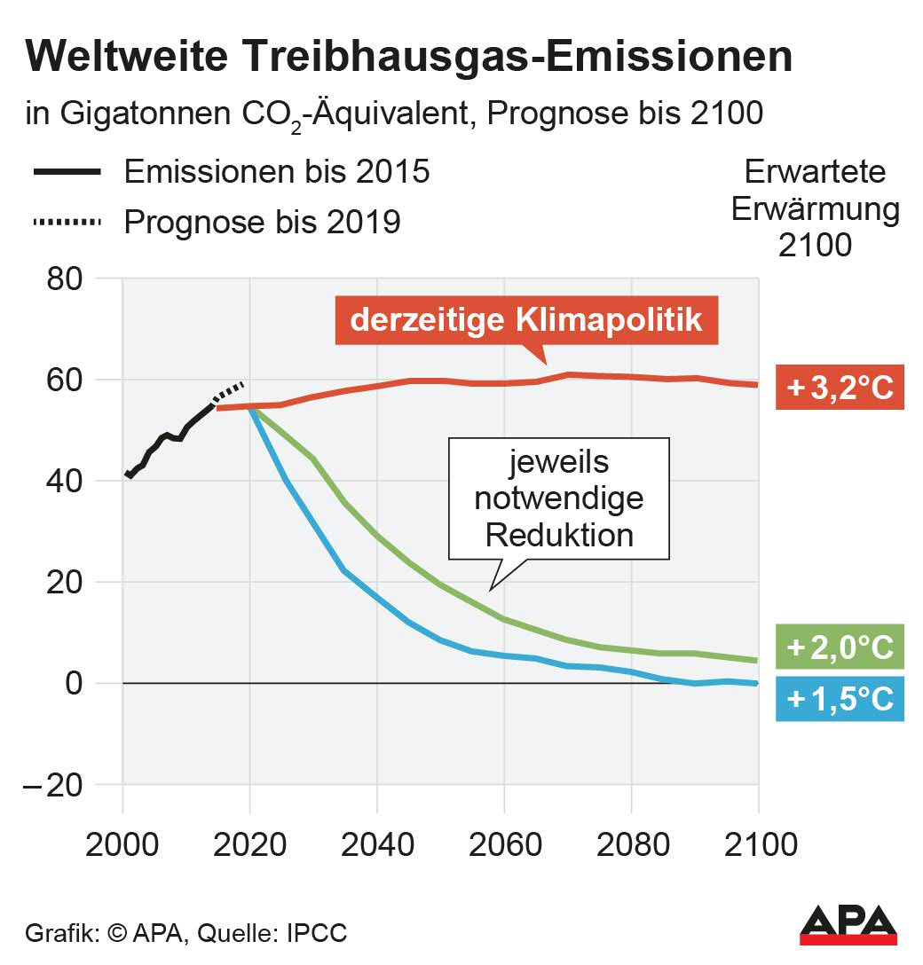 Die Emissionen sollten bereits jetzt zurückgehen und müssen bis 2030 um fast die Hälfte gesenkt werden, wenn die Erwärmung auf 1,5 Grad im Vergleich zur vorindustriellen Zeit begrenzt werden soll - aus jetziger Sicht würde das Ziel bereits in den 2030er-Jahren überschritten werden, aktuell liege die Erderwärmung bei 1,1 Grad im Vergleich zum vorindustriellen Zeitalter. Auf eine Begrenzung hatte sich die Staatengemeinschaft in den Pariser Klimazielen im Jahr 2015 geeinigt.