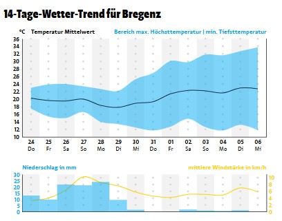 - Dienstag: Weiterhin nass und kühl, mit wenig bis keiner Sonneneinstrahlung. Höchstwerte 15 bis 20 Grad.