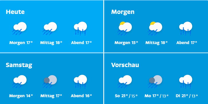 - Montag: Kräftiger Regen, vor allem tagsüber, mit maximal 18 Grad.