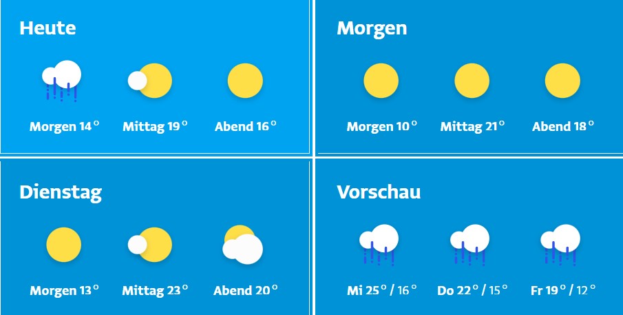 Nachdem die morgendlichen Regenschauer abgezogen sind, wurde es am Sonntag zunehmend sonnig mit einer Temperatur von 21 Grad. Die neue Woche beginnt mit wärmenden Sonnenstrahlen. Örtliche Frühnebelfelder lösen sich auf und es wird die meiste Zeit ungetrübt sonnig sein. Zeitweise sind dünne aufgelockerte Wolkenfelder weit über den Berggipfeln zu sehen. Auf einen sehr frischen bis kalten Morgen folgt ein warmer Nachmittag. Die Tiefstwerte liegen bei 3 bis 10 Grad, die Höchstwerte bei 19 bis 25 Grad.