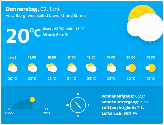 Der Freitag bringt eine Mischung aus Sonne und Wolkenfeldern, die zeitweise dichter ausfallen. Dazu ist es leicht föhnig und es wird etwas wärmer als zuletzt. Einzelne Schauer sind in der Früh nicht ausgeschlossen. Vor allem gegen Abend besteht aber eine erhöhte Gewittergefahr, insbesondere im Unterland. Und diese Gewitter können auch heftig ausfallen. Tiefstwerte: 10 bis 15 Grad, Höchstwerte: 22 bis 27 Grad.