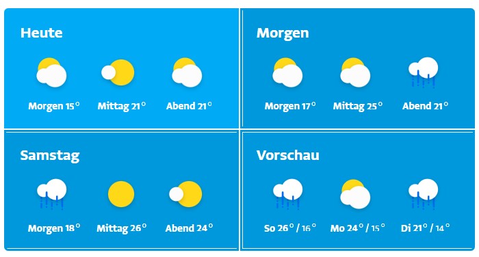 Am Samstag wird es dann meist sonnig, sommerlich warm und eher schwül, am Nachmittag quillt es stärker, aber mit nur wenigen Schauern. Auch am Sonntag sind Sonne und schwülwarme Temperaturen zu erwarten, hier kann es gegen Nachmittag Abend jedoch wieder zu heftigeren Gewittern kommen.