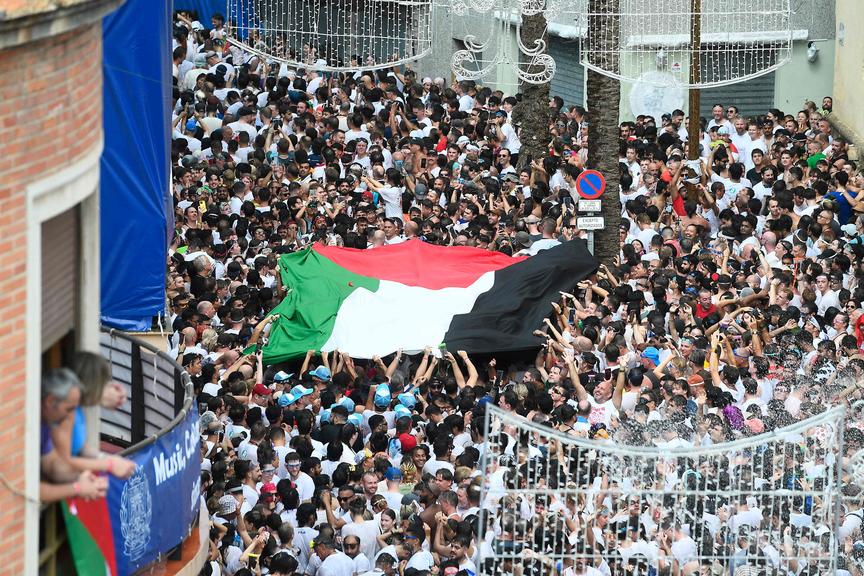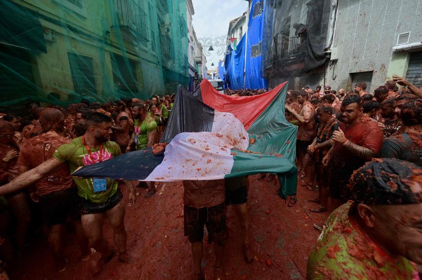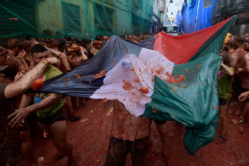 Die "Krieger" waren teils mit Tauchermasken ausgestattet. Einige trugen aus Solidarität mit den leidenden Menschen im Gazastreifen Palästina-Fahnen. Schon kurz nach Beginn der "Schlacht" um 12.00 Uhr wurden der Hauptplatz und die Straßen Buñols rund 40 Kilometer westlich der Metropole Valencia von einer matschig-roten Brühe überzogen.