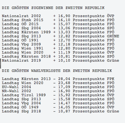 Weil die FPÖ immer wieder steile Aufstiege (erst unter Jörg Haider, dann unter Heinz-Christian Strache) und herbe Abstürze (zuletzt den Ibiza-Crash) erlebt, findet sie sich häufig in der Liste der zweistelligen Zugewinne und Verluste: Das dritt- und viertgrößte Minus musste ebenfalls die FPÖ verkraften, und zwar beim Absturz als Teil der schwarz-blauen Bundesregierung - bei der EU-Wahl 2004 (17,1 Prozentpunkte) und bei der Nationalratswahl 2002 (16,9).