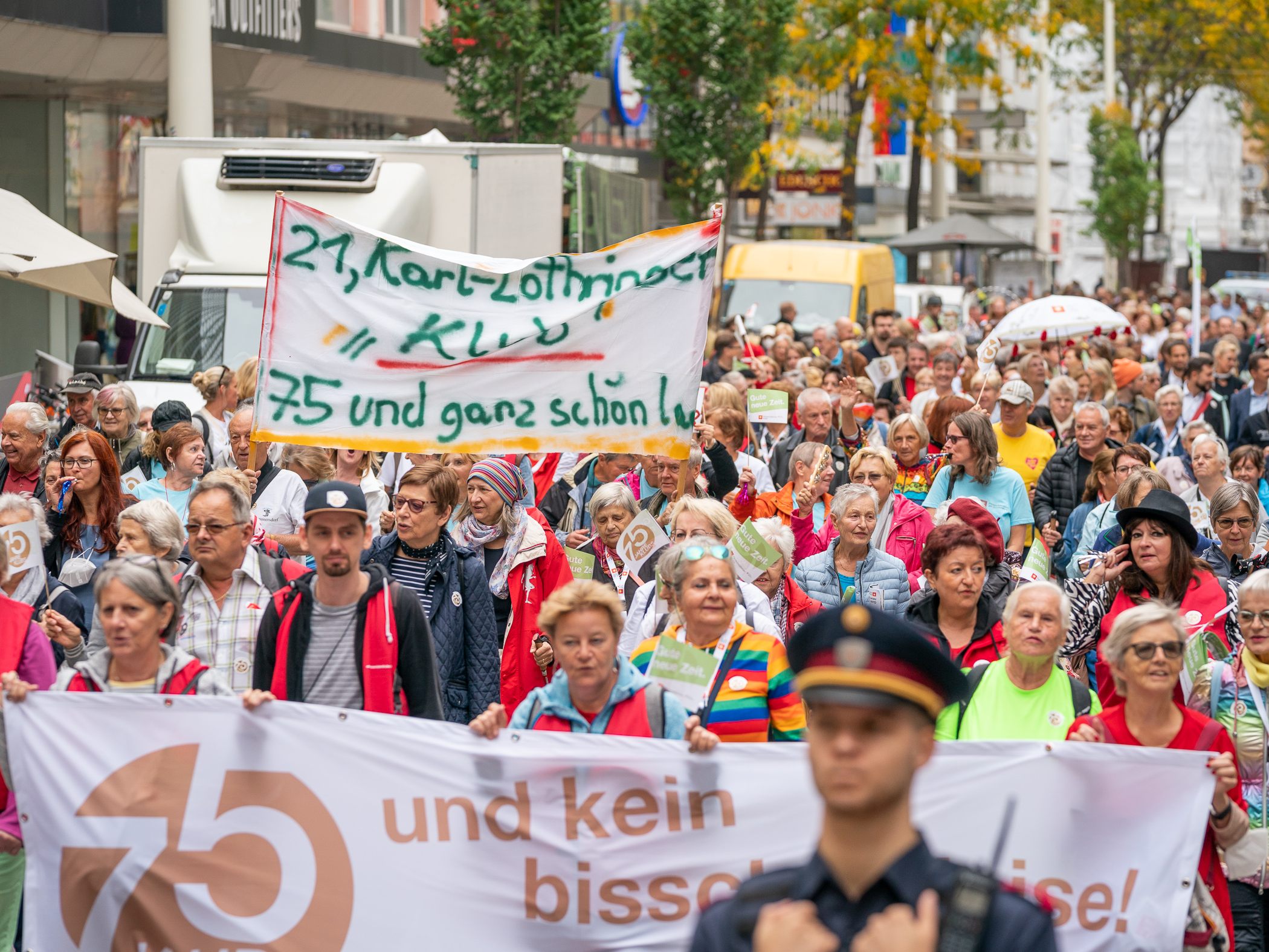 Trommeln, Megaphone, Sprechchöre, Transparente, Trillerpfeifen, Ratschen: Mit viel Lebensfreude und ein wenig Augenzwinkern feierten rund 500 KlubbesucherInnen, BewohnerInnen der Häuser zum Leben und das Team der PensionistInnenklubs für die Stadt Wien im Rahmen einer Parade ihren 75. Geburtstag. Mit der Jubiläumsparade sorgten die PensionistInnenklubs für eine Menge Aufmerksamkeit und eine positive Wahrnehmung. Sie luden so zur Teilhabe der Generationen 60, 70, 80, 90 plus in die Klubs ein.