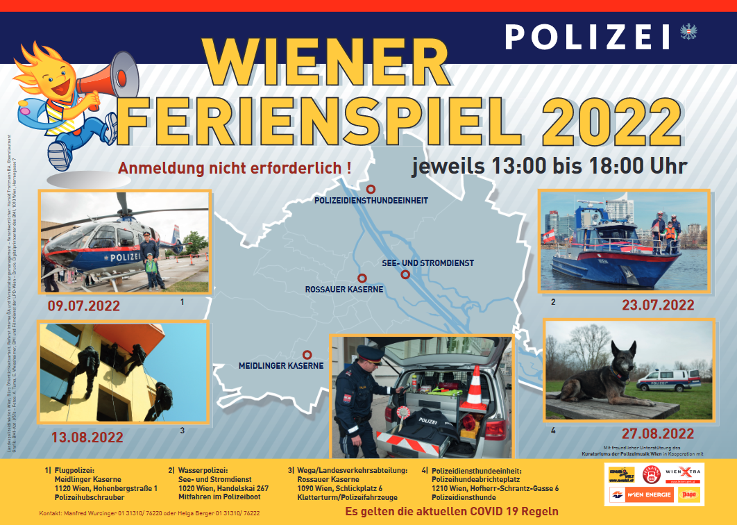 Schon jetzt möchte die Landespolizeidirektion Wien auf den nächsten Ferienspieltermin der Wiener Polizei am 13. August 2022, von 13:00 bis 18:00 Uhr unter dem Motto: „Ein Tag bei der WEGA und Landesverkehrsabteilung“ hinweisen. Dieser findet in Wien 9., Schlickplatz 6 statt.