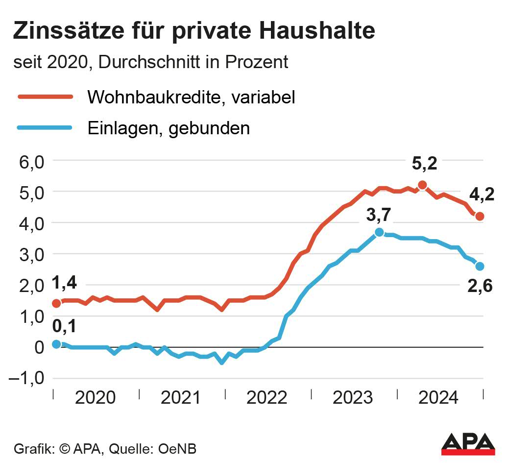 "Der Zinssatz für neu vergebene Kredite an private Haushalte ging im Jahr 2024 um 1,05 Prozent auf 4,30 Prozent, und damit den geringsten Wert seit zwei Jahren, zurück", merkte Edeltraud Stiftinger, Vize-Gouverneurin der OeNB, an. Trotz der regen Nachfrage nach Wohnbaudarlehen sank das gesamte aushaftende Kreditvolumen privater Haushalte gegenüber dem Jahr zuvor von 187,2 Mrd. auf 185,6 Mrd. Euro.