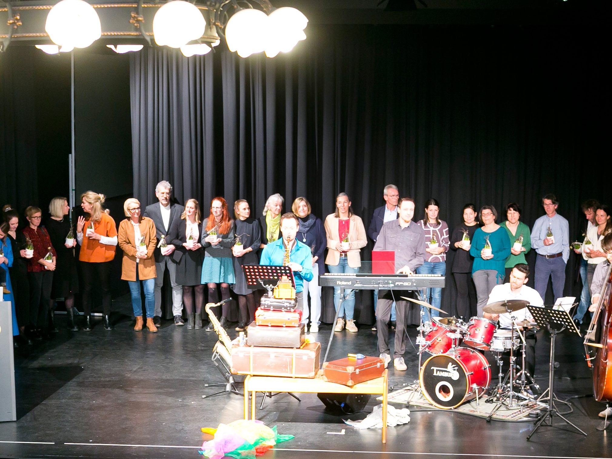 Im Anschluss an das Symposium lud das Team der Palliativstation gemeinsam mit der Krankenhausleitung im Hohenemser Löwensaal zum feierlichen Festakt. Die Begrüßung übernahm Landesrätin Martina Rüscher, MBA, MSc gemeinsam mit Verwaltungsdirektor Andreas Lauterer, BSc, MA. Anschließend blickten Chefarzt Priv. Doz. Dr. Günter Höfle, Pflegedirektor Arno Geiger, MSc und der leitende Oberarzt Dr. Gehmacher auf die Erfolge und Herausforderungen in der Palliativmedizin der vergangenen zwei Jahrzehnte zurück und wagten auch einen Ausblick in die Zukunft: „Unsere Herausforderungen bleiben vielfältig, angefangen vom Ausbau des mobilen Palliativteams über die Etablierung eines palliativen Konsiliar-Dienstes bis zur Begegnung mit dem neuen Sterbehilfe-Gesetz.“ Unter den Ehrengästen waren auch Bischof Benno Elbs und Bürgermeister Dieter Egger. Den Abschluss des Rahmenprogramms gestaltete Sepp Gröfner, Leiter der Telefonseelsorge, mit dem humoristischen Beitrag „Flädlesuppe ist gut gegen Sterben...“.