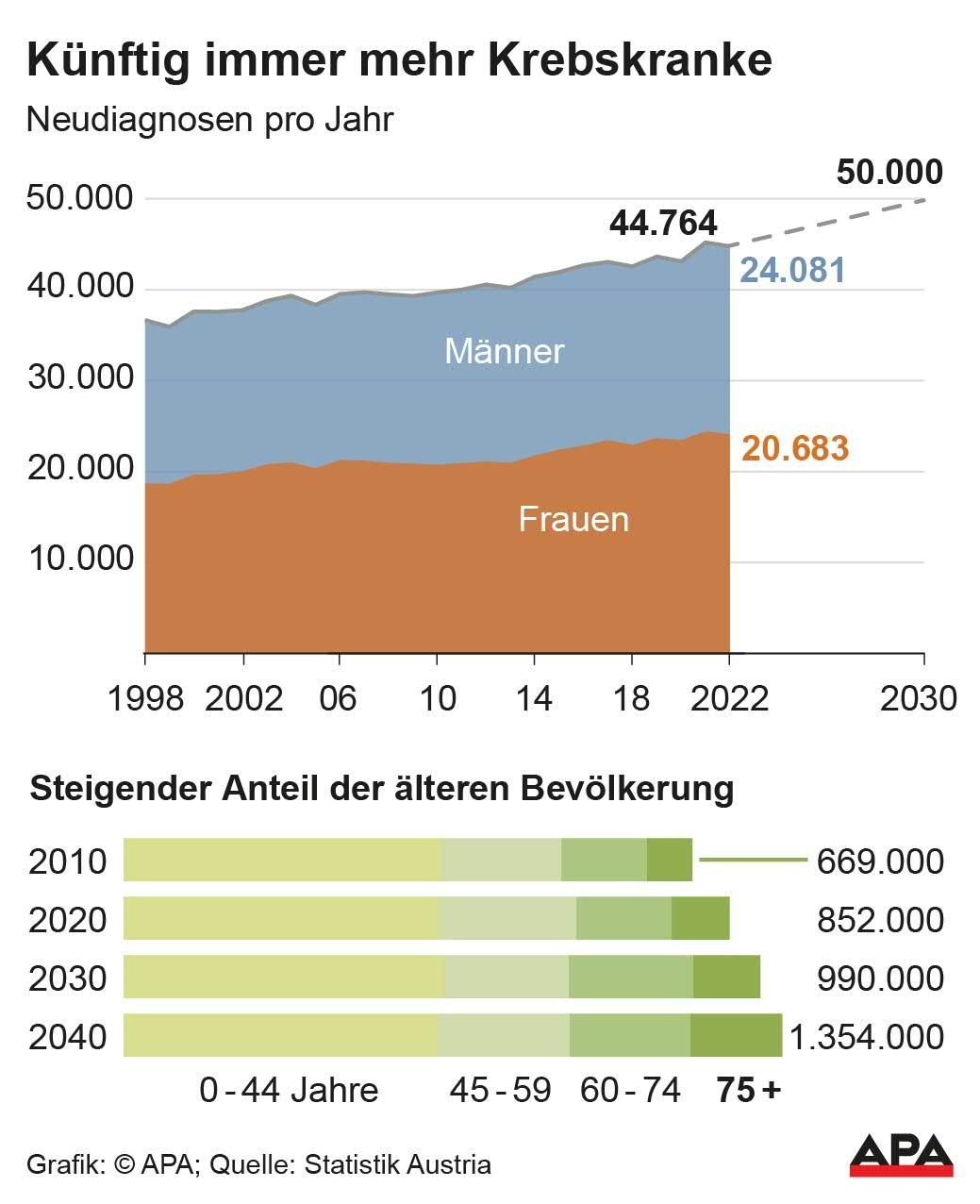 In Summe nimmt die Zahl der Krebsneuerkrankungen laut Statistik Austria von Jahr zu Jahr zu. Dies liege auch an der Alterung der Bevölkerung, denn Alter ist einer der größten Risikofaktoren. Bis 2030 dürfte die Zahl der Bevölkerung im Alter von 75 plus im Vergleich zu 2020 um 16 Prozent wachsen, bis 2040 um knapp 60 Prozent.