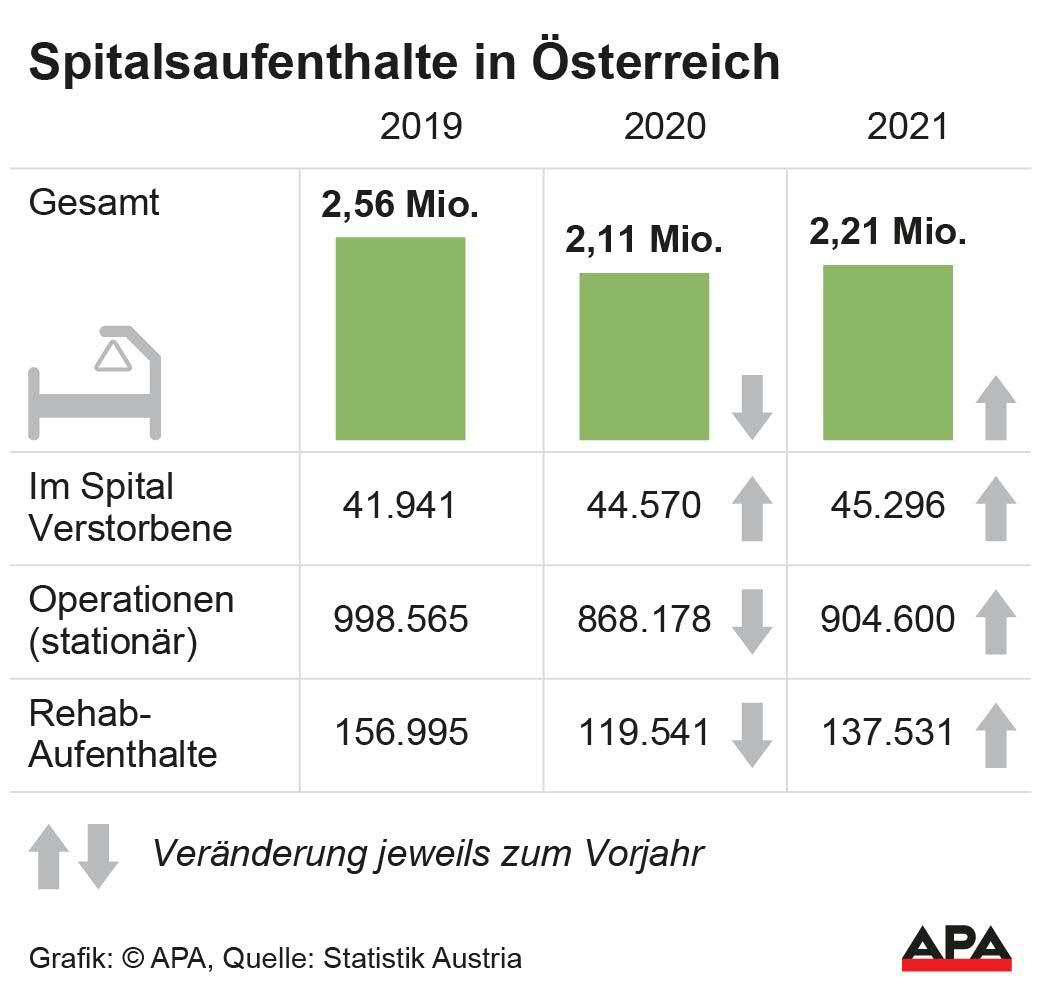 Die Zahl der im Spital verstorbenen Patienten stieg - um 1,6 Prozent mehr als 2020 und acht Prozent mehr als 2019. Rehabilitationen nahmen im Vergleich zu 2020 um 15 Prozent zu, dennoch waren es 12,4 Prozent weniger als 2019.
