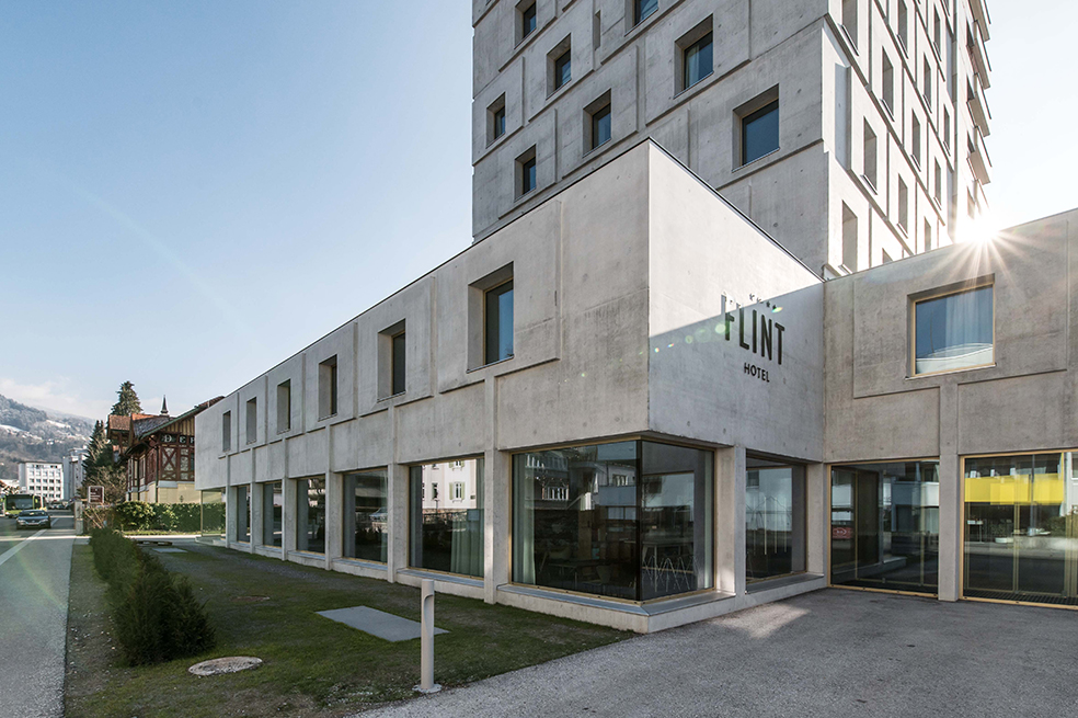 Mit dem "Flint" hat Dornbirn in unmittelbarer Bahnhofnähe ein neues Vier-Sterne-Hotel bekommen. Dessen Name damit zu tun hat, dass sein Besitzer bzw. Betreiber die Vorarlberger Unternehmerfamilie Feurstein ist. Und das zu entwerfen für Walter Feurstein nur die Besten der Architektenzunft infrage gekommen sind und die sind für ihn eindeutig Bernhard und Stefan Marte (Marte.Marte Architekten).