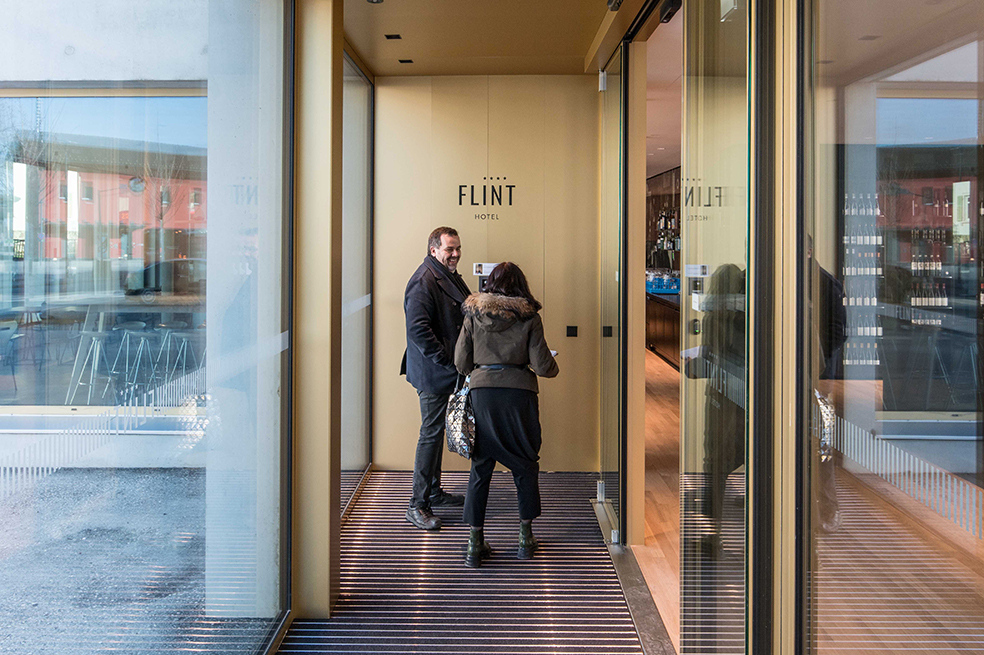 Der an das Bestandsgebäude angedockte neungeschoßige Turm wächst aus einem zweigeschoßigen Sockel mit z-förmigem Zuschnitt in die Höhe. Um auf diese Weise den kleinen, mit geschliffenem Asphalt versehenen Vorplatz zu einem in das Hotel einladenden Stückchen Stadtraum zu machen. Dieser Sockel ist im Erdgeschoß zur Gänze raumhoch verglast, wobei die Fenster bzw. die Eingangstür zum Hotel edel mit goldfarben eloxiertem Alu gerahmt sind. Hier im Sockel ist neben der mit einem riesigen skulpturalen Tisch aus Schwarzstahl markierten Rezeption das mit Designklassikern möblierte "Wohnzimmer" samt Kamin und Stampflehmmauer eingerichtet. Genauso wie der Bereich, in dem gefrühstückt wird sowie die Bar mit ihrem mächtigen Tresen aus dunklem Granit und eine kleine Bibliothek. Die Wände sind teilweise golden, die hinter der Bar ziert ein ins Monumentale aufgeblasenes altes Foto, das mit der Weinstube zu tun hat, die 1867 der Bozner Josef Weiss in der feudalen denkmalgeschützten Villa gleich nebenan eingerichtet hat, bevor es als Hotel Weiss zum ersten Haus am Platz werden sollte. Um – sorgsam restauriert – als feine Dependance des Hotels als "Villa Flint" nun eine Renaissance zu erleben.