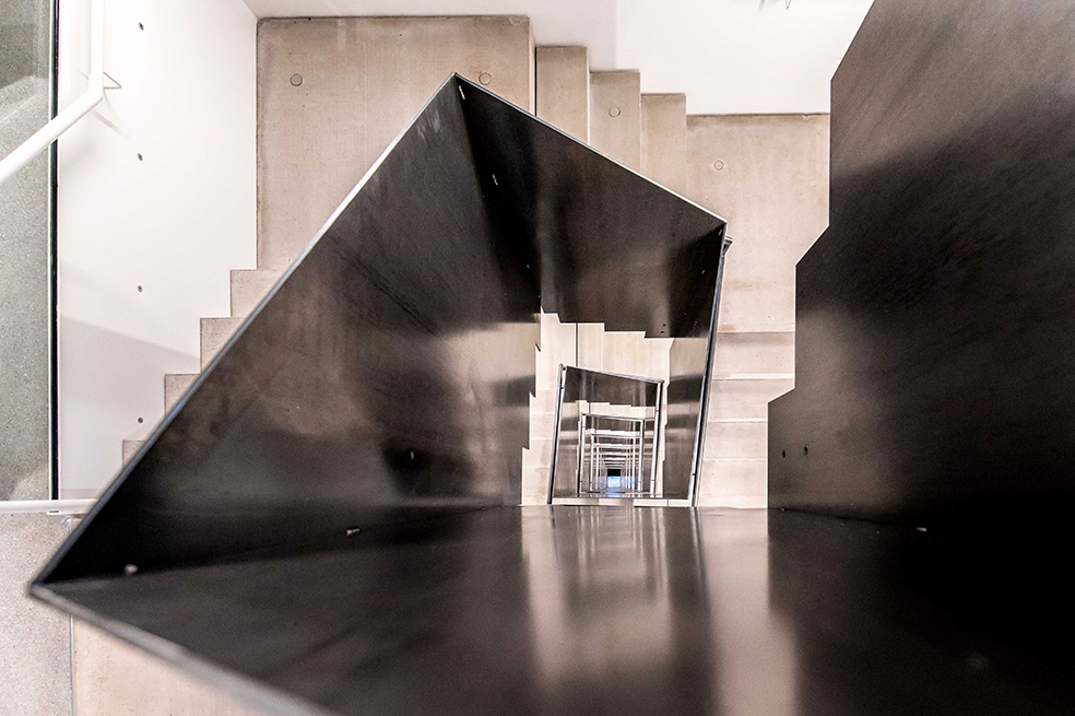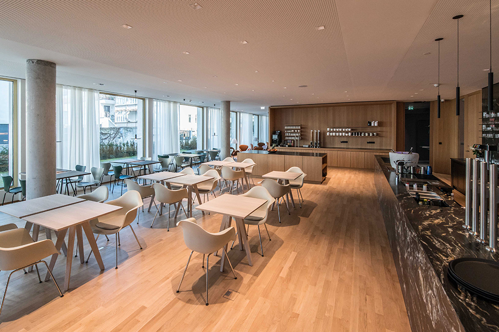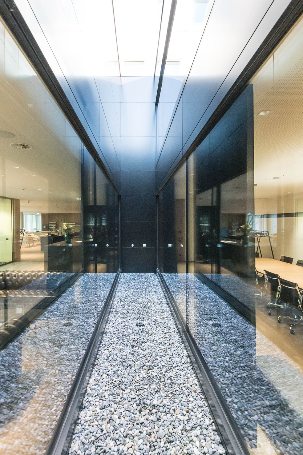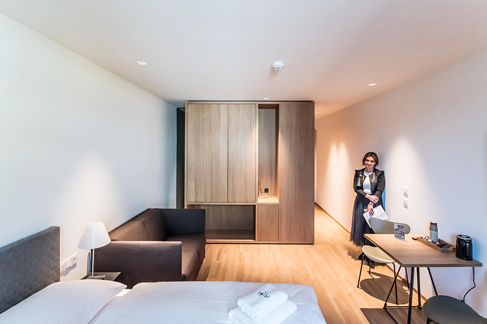 Rückseitig im Sockel gibt es Seminarräume, darüber liegt der Wellnessbereich, in dem ein grünlich vulkanischer Stein aus Afrika dominiert, mit dem etwa die höhligen Duschen ausgekleidet sind. Die Durchblicke zur Lobby über einen schmalen verglasten Lichthof tun gut, um mental nicht abzuheben. Die betonierte Treppe des Stiegenhauses – die neben einem Lift den Zimmerturm erschließt – windet sich in minimalem Radius kühn nach oben. Flankiert durch eine durchgehende massive Brüstung aus Schwarzstahl. Die mit hellgrauen Sisalteppichen belegten Gänge, die zu den mehr als 70 Zimmern führen, werden durch Leuchten erhellt, die wie Fackeln regelrecht aus den weißen Wänden herauszuwachsen scheinen. Die Zimmer sind mehr oder weniger klein, der Platz ist mit viel kreativem Hirnschmalz perfekt ausgenützt, die räumliche Ausstattung ebenso hochwertig wie schnörkellos funktionell. Atmosphärisch tun die Fototapeten mit Bezügen zur alten Villa gut. Und dass der Blick von den Zimmern nach außen mit jedem Stockwerk höher immer noch besser wird, versteht sich von selbst.