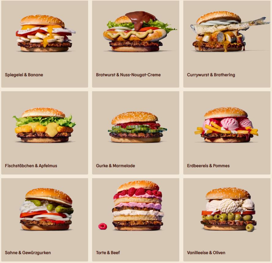 Dass Schwangere mitunter seltsame Gelüste haben können, ist weithin bekannt. Ob einige davon am kommenden Sonntag bei der Burger King-Filiale Tempelhofer Damm in Berlin gestillt werden können, wird sich zeigen! Denn das Fast Food-Restaurant wartet anlässlich des Muttertags mit einer skurrilen Werbe-Aktion auf: Neun "wilde" Burger-Kombinationen werden allen werdenden Müttern exklusiv am Sonntag angeboten. Und: Der schräge Burger geht aufs Haus, verspricht der Fastfood-Riese.
