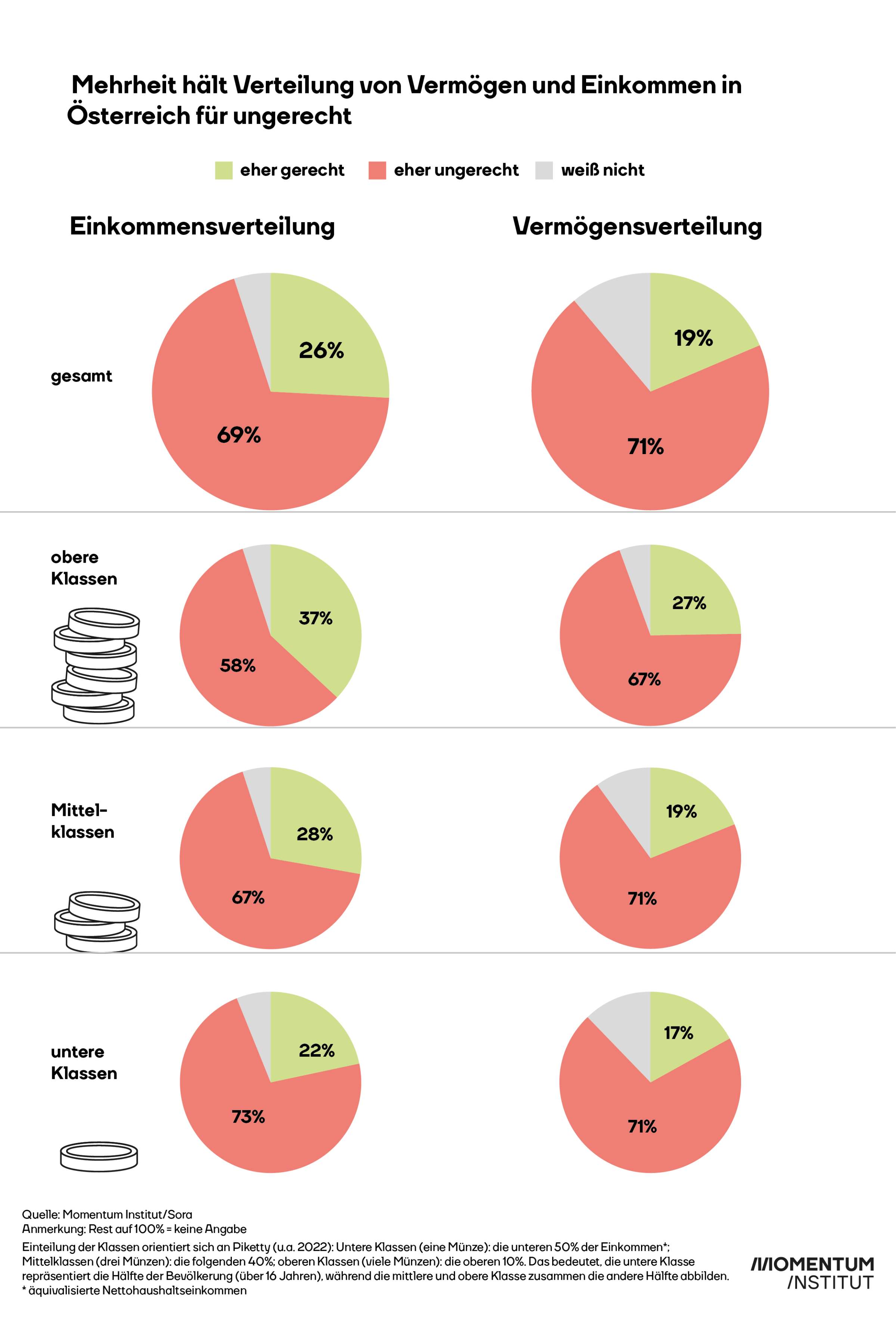 Grundsätzlich sind sieben von zehn Menschen im Land der Meinung, dass Einkommen und Vermögen ungerecht verteilt sind, wie eine SORA-Studie im Auftrag des arbeitnehmervertretungsnahen Momentum Instituts ergab. Drei Viertel der Menschen finden, dass das politische System nicht funktioniert.