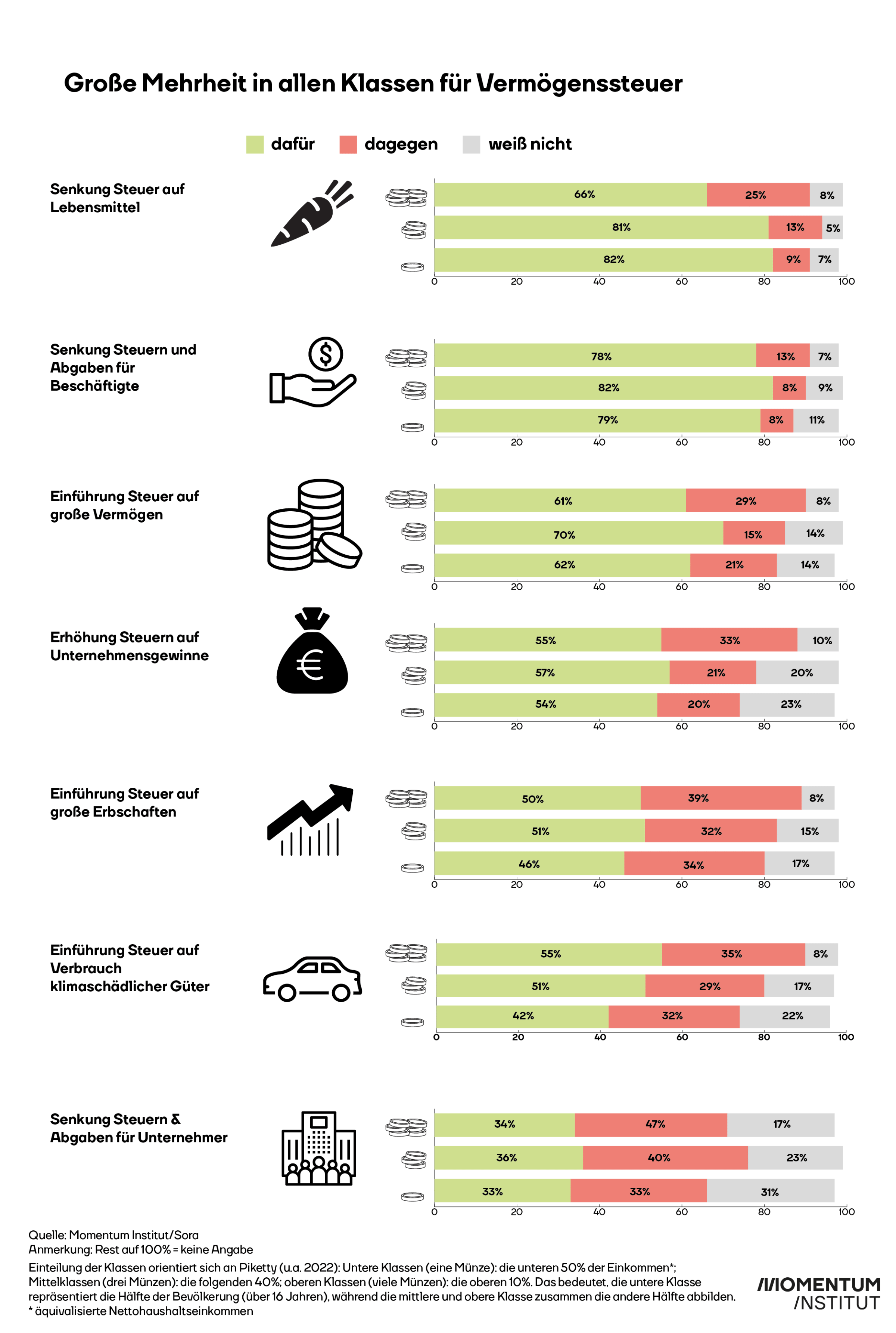 Abgefragt wurde auch die Bewertung konkreter politischer Maßnahmen. So spricht sich mit jeweils 80 Prozent eine deutliche Mehrheit für eine Senkung der Steuer auf Lebensmittel und für Steuersenkungen für Beschäftigte aus. Knapp die Hälfte der Menschen halten die Einführung einer Erbschaftssteuer sowie klimabezogener Steuern für gut. Auch in der Steuerpolitik zeige sich klassenübergreifende Übereinstimmung, wenn auch in unterschiedlichem Ausmaß, betonte Dobisch: Die unteren 90 Prozent stimmen häufiger als die oberen zehn für Steuersenkungen auf Lebensmittel und Steuererhöhungen auf Unternehmensgewinne.