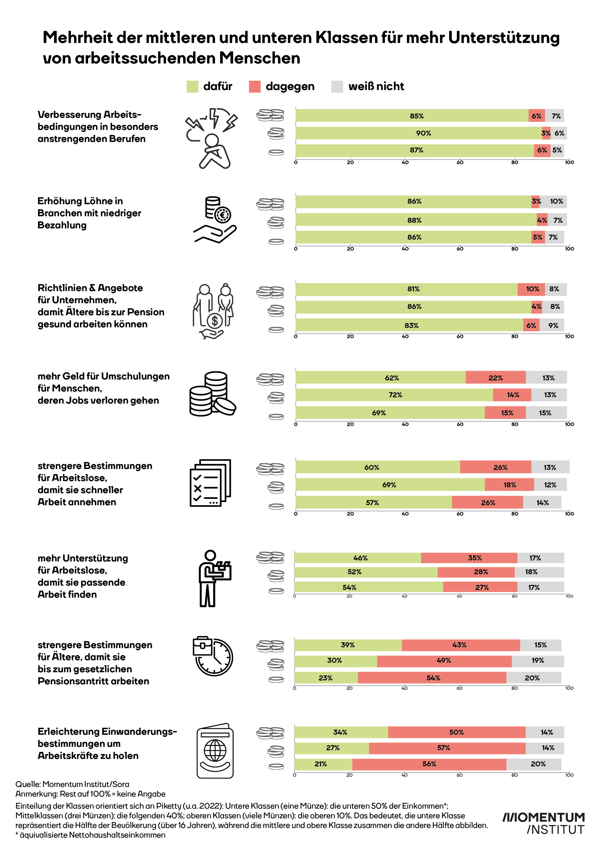 Neun von zehn Menschen sind außerdem für Lohnerhöhungen in Branchen mit niedriger Bezahlung und für die Verbesserung der Arbeitsbedingungen in besonders anstrengenden Berufen. Im Kampf gegen die Arbeitslosigkeit halten rund 70 Prozent mehr Geld für Umschulungen für das richtige Mittel. Ebenso sind aber auch 62 Prozent für strengere Bestimmungen für arbeitslose Menschen, damit diese schneller eine Arbeit annehmen müssen.