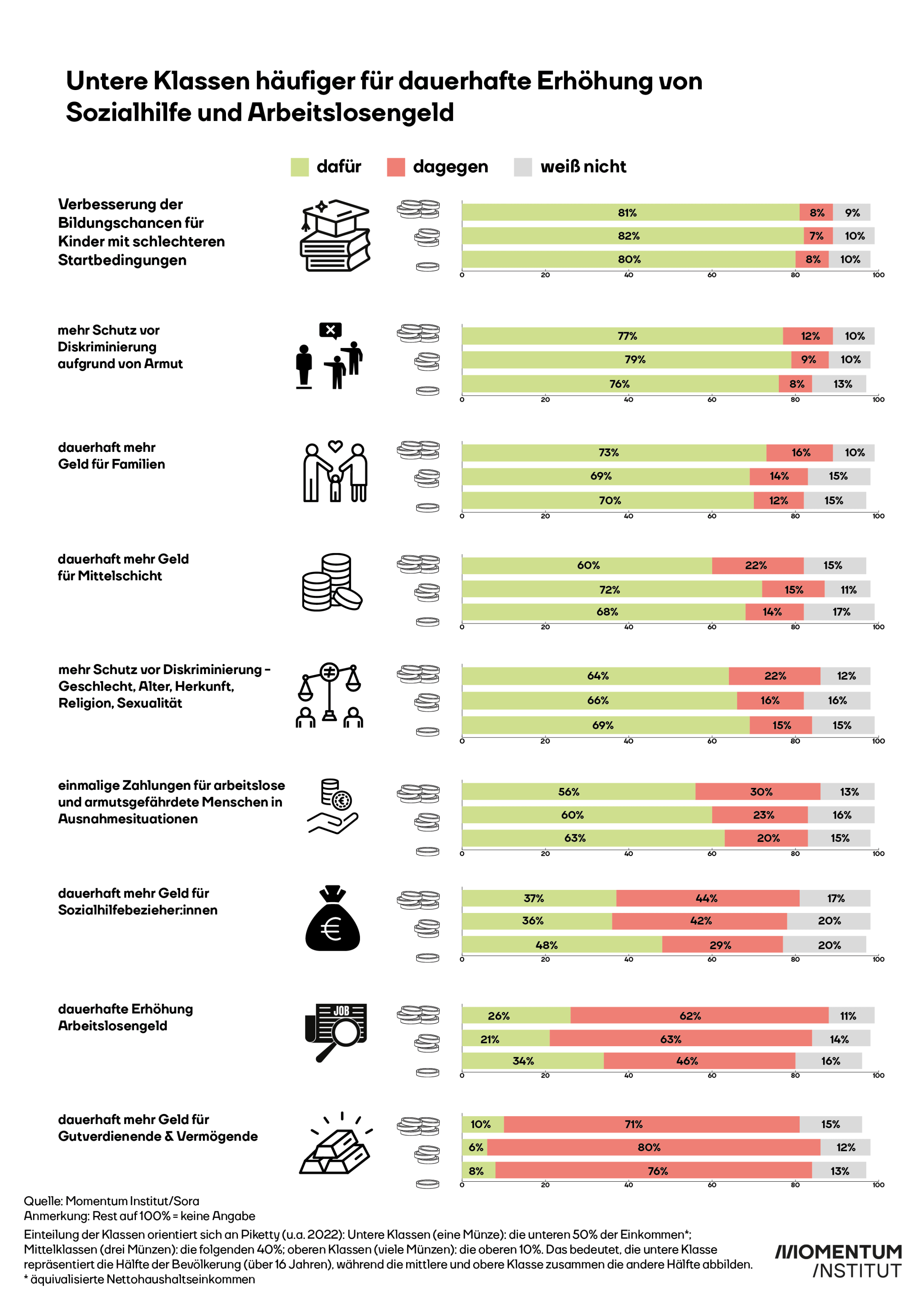 Einig sind sich alle Einkommensschichten darüber, dass es Maßnahmen zur Verbesserung der Bildungschancen für Kinder mit schlechteren Startbedingungen, mehr finanzielle Leistungen für Familien und besseren Schutz vor Diskriminierung aufgrund von Armut brauche.