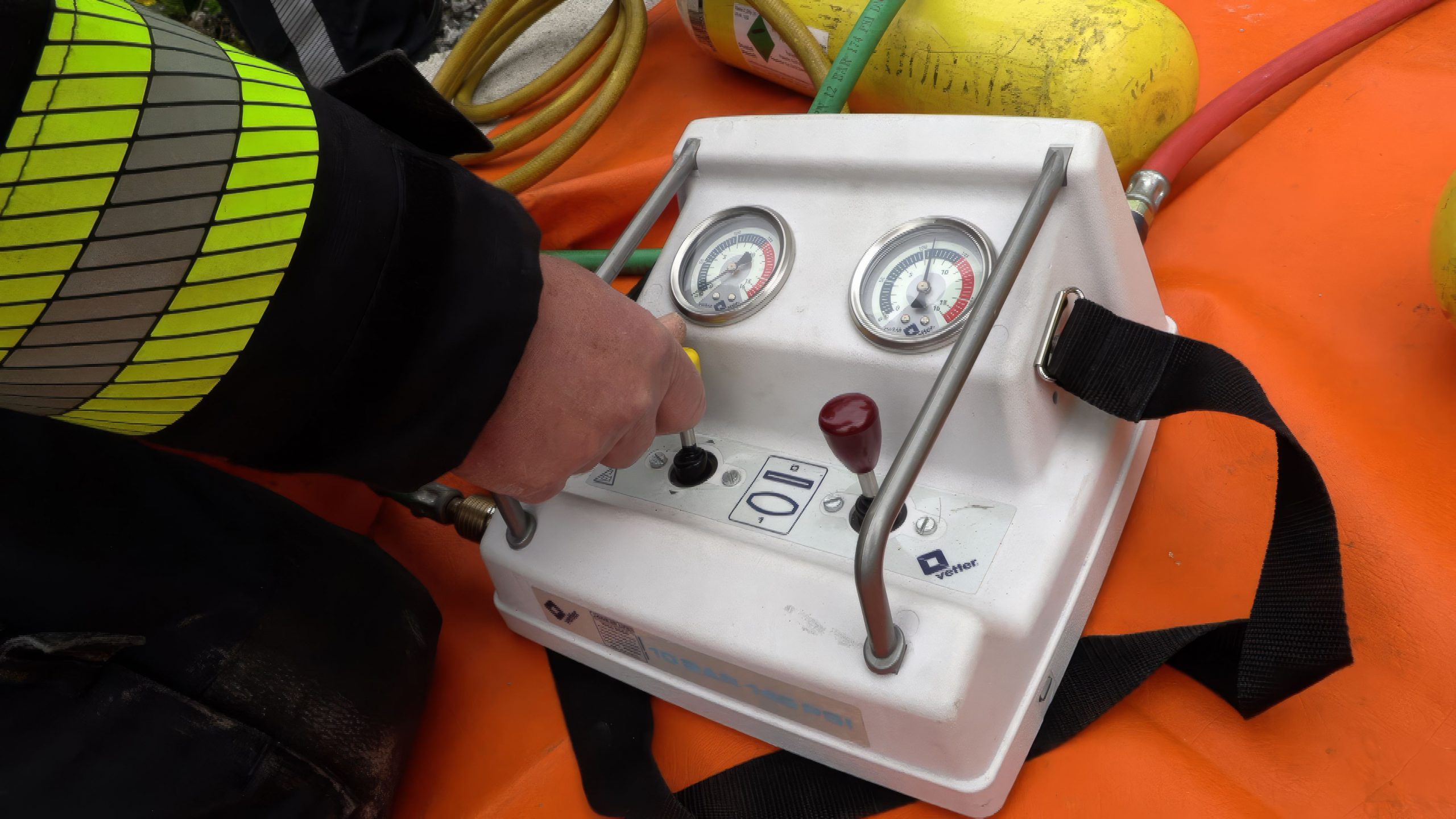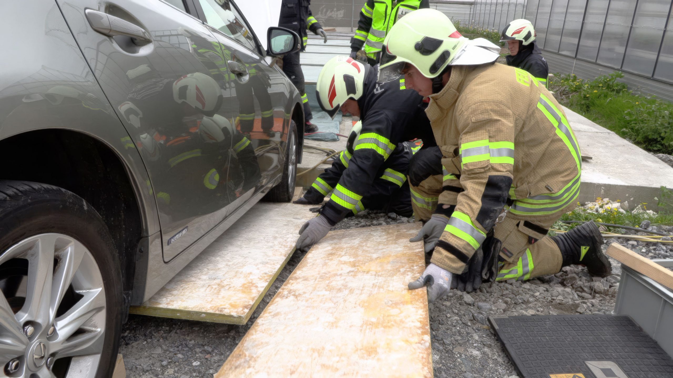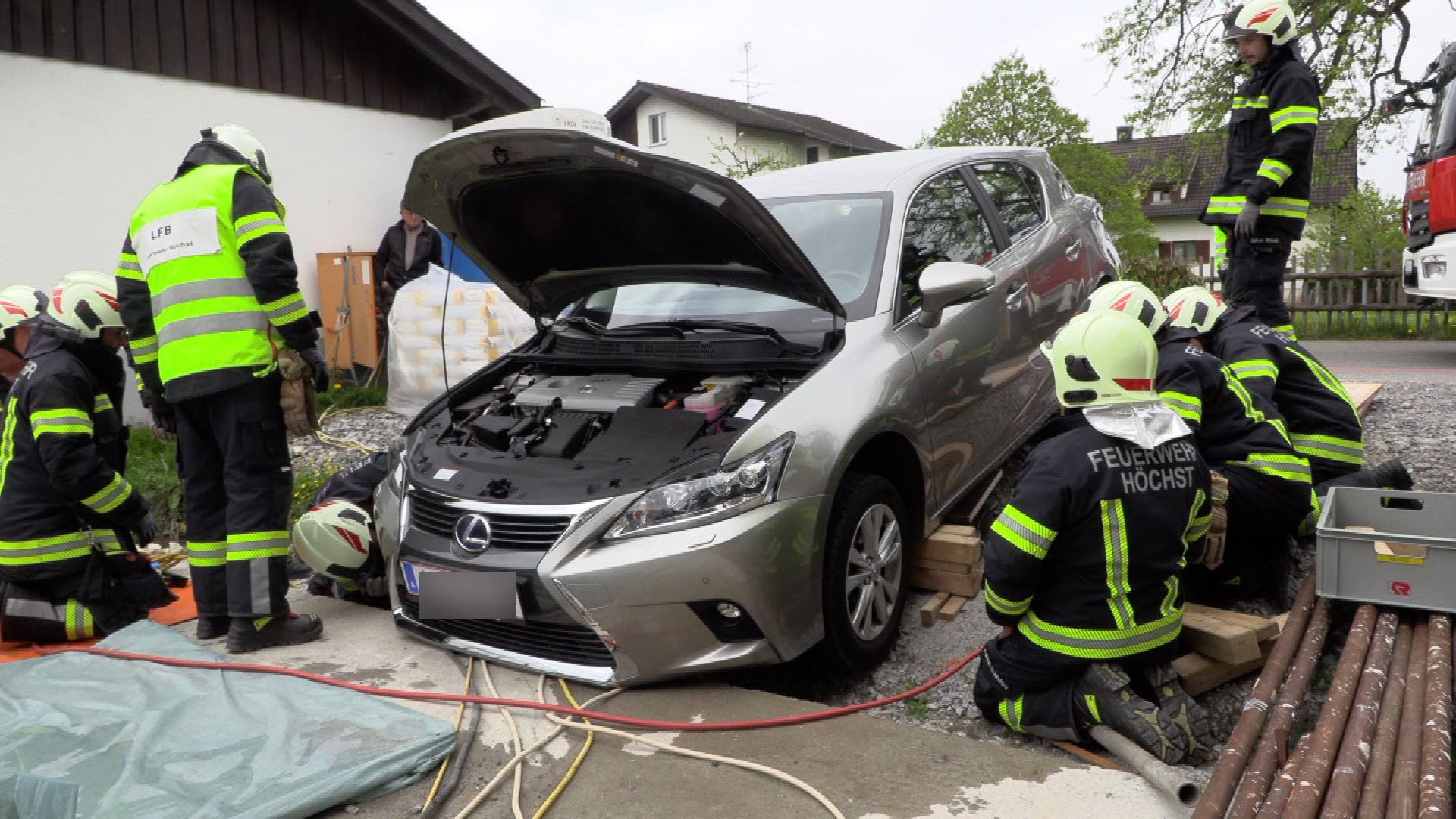 Die Feuerwehr Höchst sicherte das Auto mittels Hebekissen und Holzunterlagen, wodurch das Fahrzeug nahezu unbeschädigt geborgen werden konnte.