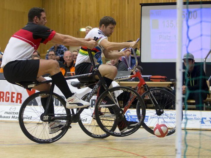 Überaus spannend war schon die Ausgangslage im Radball. Die amtierenden Weltmeister Höchst 1 mit Patrick Schnetzer / Markus Bröll lagen in der Gesamtwertung der bisher gespielten 3 Runden mit 3 Punkten in Front. Die Verfolger Höchst 2 Florian Fischer / Simon König waren ebenfalls top motiviert und wollten dieses Jahr die spielende Mannschaft in Malaysia werden. Nachdem beide Mannschaften Ihre „Pflichtsiege“ gegen Dornbirn 1 und Sulz/Dornbirn gewonnen hatten, kam es zum Showdown im letzten Match. Die Vereins- kollegen waren top konzentriert und schenkten sich nichts. Ein offener Schlagabtausch mit Toren auf beiden Seiten endete schlußendlich mit einem Sieg durch Höchst 2 über Höchst 1 mit 3:2 und sicherte sich somit den Staatsmeistertitel.. Aufgrund der Gleichstellung in der WM-Wertung kam es dann zum Entscheidungsspiel um die WM-Teilnahme. Beide Mannschaften versuchten in den verbleibenden 7 Minuten die Entscheidung herbeizuführen. Bis zu 1:30 min vor Schluß stand es noch unentschieden, jedoch dann preschte Höchst 1 mit 2 schnellen Toren auf 3:1 davon. In den Schlußsekunden konnte Höchst 2 noch 1 Tor aufholen und zum 2:3 verkürzen aber die Zeit reichte nicht für mehr. Somit sicherten sich die amtierenden Weltmeister Patrick Schnetzer und Markus Bröll die Teilnahme in Malaysia, wo sie Ihren Titel von 2013 und 2014 verteidigen dürfen. Florian Fischer und Simon König dürfen sich jedoch mit dem Staatsmeistertitel schmücken und sind als Ersatzmannschaft ebenfalls mit dabei.